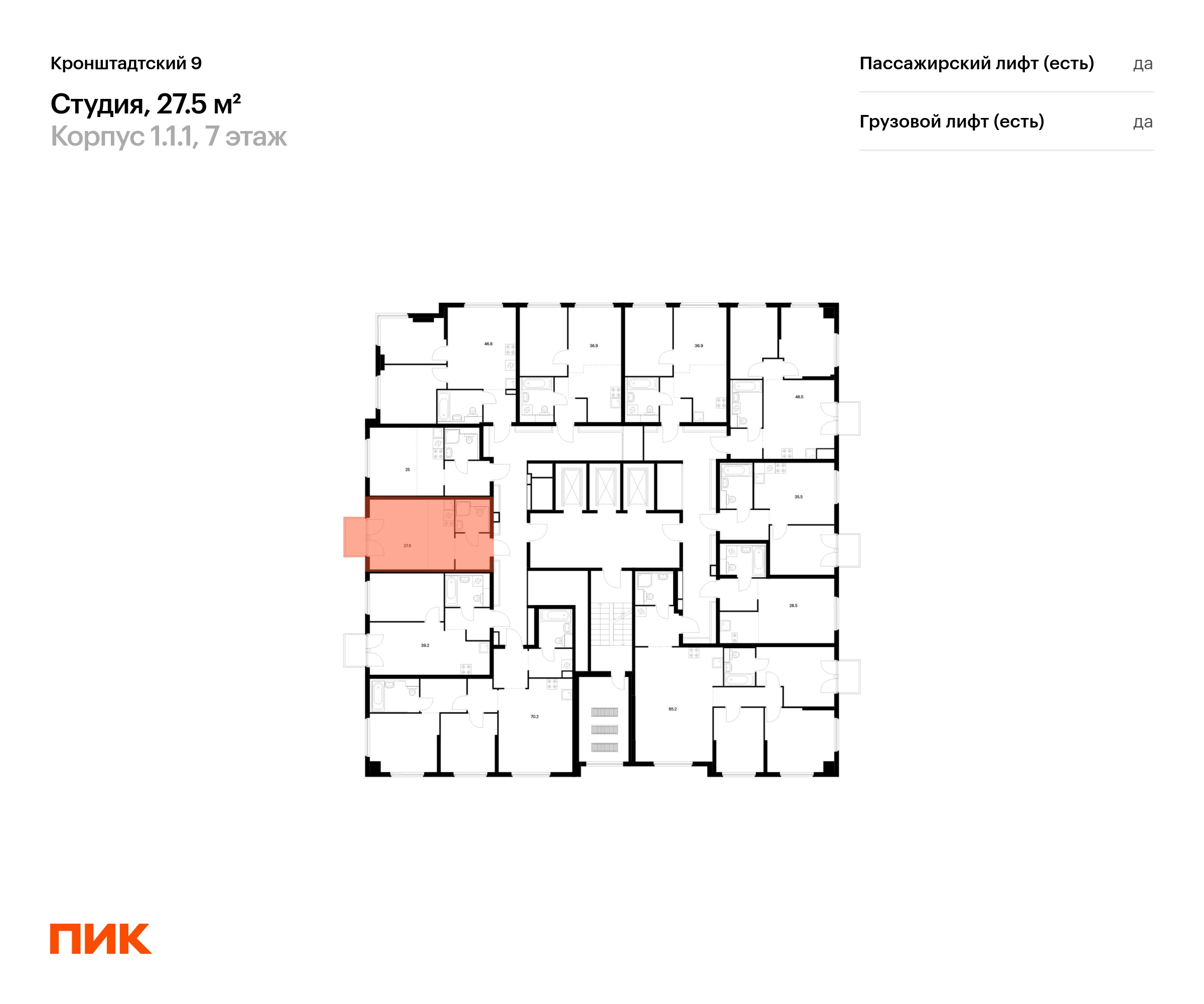 В Головинском районе продаётся студия квартира площадью 27.5 на 7 этаже 12 этажного дома (корпус 1.1.1, секция 1) в проекте ПИК «Кронштадтский 9». Удобное расположение 3 минуты пешком до станции метро «Водный стадион». 2 минуты на автомобиле до Ленинградского шоссе, 10 минут до ТТК и 16 минут до МКАД. 4 минуты пешком до ТЦ «Водный». 15 минут пешком до парка у Головинских прудов и 18 минут до парка «Дружба». Особенности проекта «Кронштадтский 9» — квартал «Серии плюс» с уникальной архитектурой. У проекта собственная инфраструктура, а удобные и разнообразные планировки позволят каждому выбрать квартиру для собственного сценария жизни. Преимущества проекта: Отделка: Дизайнерские лобби с зонами ожидания, кондиционерами, быстрыми тихими лифтами. Два детских сада на территории проекта. Дворы-парки с игровыми и спортивными площадками. Магазины, кафе и полезные сервисы на первых этажах домов. Подземный паркинг. АртикулО застройщике