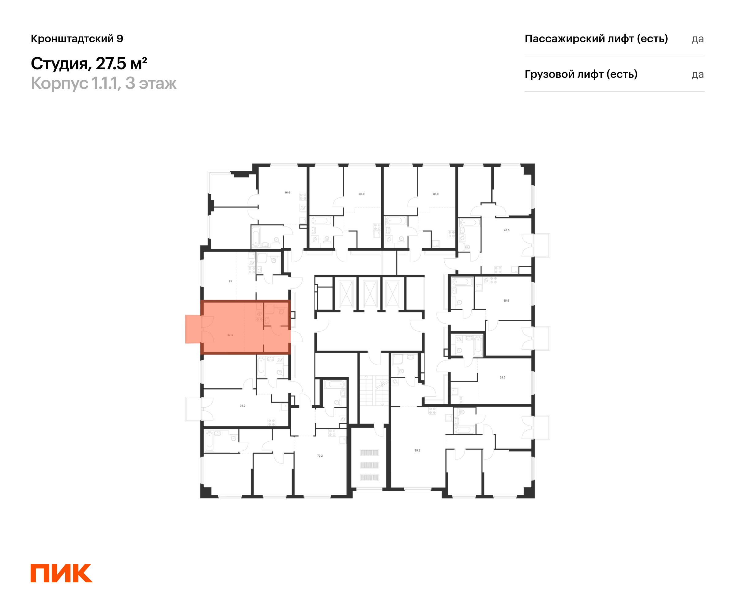 В Головинском районе продаётся студия квартира площадью 27.5 на 3 этаже 12 этажного дома (корпус 1.1.1, секция 1) в проекте ПИК «Кронштадтский 9». Удобное расположение 3 минуты пешком до станции метро «Водный стадион». 2 минуты на автомобиле до Ленинградского шоссе, 10 минут до ТТК и 16 минут до МКАД. 4 минуты пешком до ТЦ «Водный». 15 минут пешком до парка у Головинских прудов и 18 минут до парка «Дружба». Особенности проекта «Кронштадтский 9» — квартал «Серии плюс» с уникальной архитектурой. У проекта собственная инфраструктура, а удобные и разнообразные планировки позволят каждому выбрать квартиру для собственного сценария жизни. Преимущества проекта: Отделка: Дизайнерские лобби с зонами ожидания, кондиционерами, быстрыми тихими лифтами. Два детских сада на территории проекта. Дворы-парки с игровыми и спортивными площадками. Магазины, кафе и полезные сервисы на первых этажах домов. Подземный паркинг. АртикулО застройщике