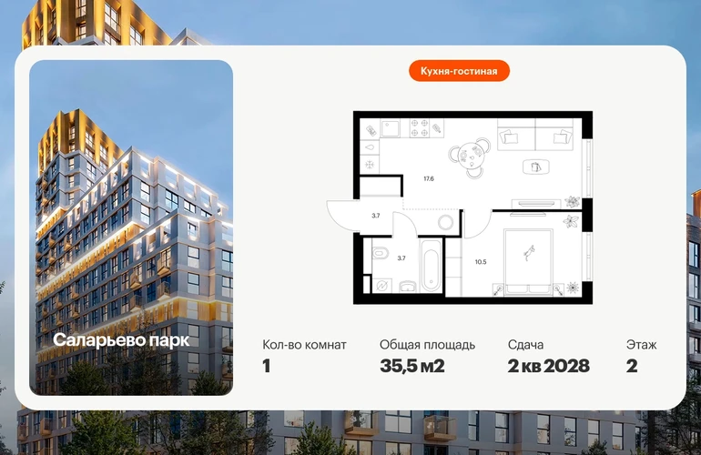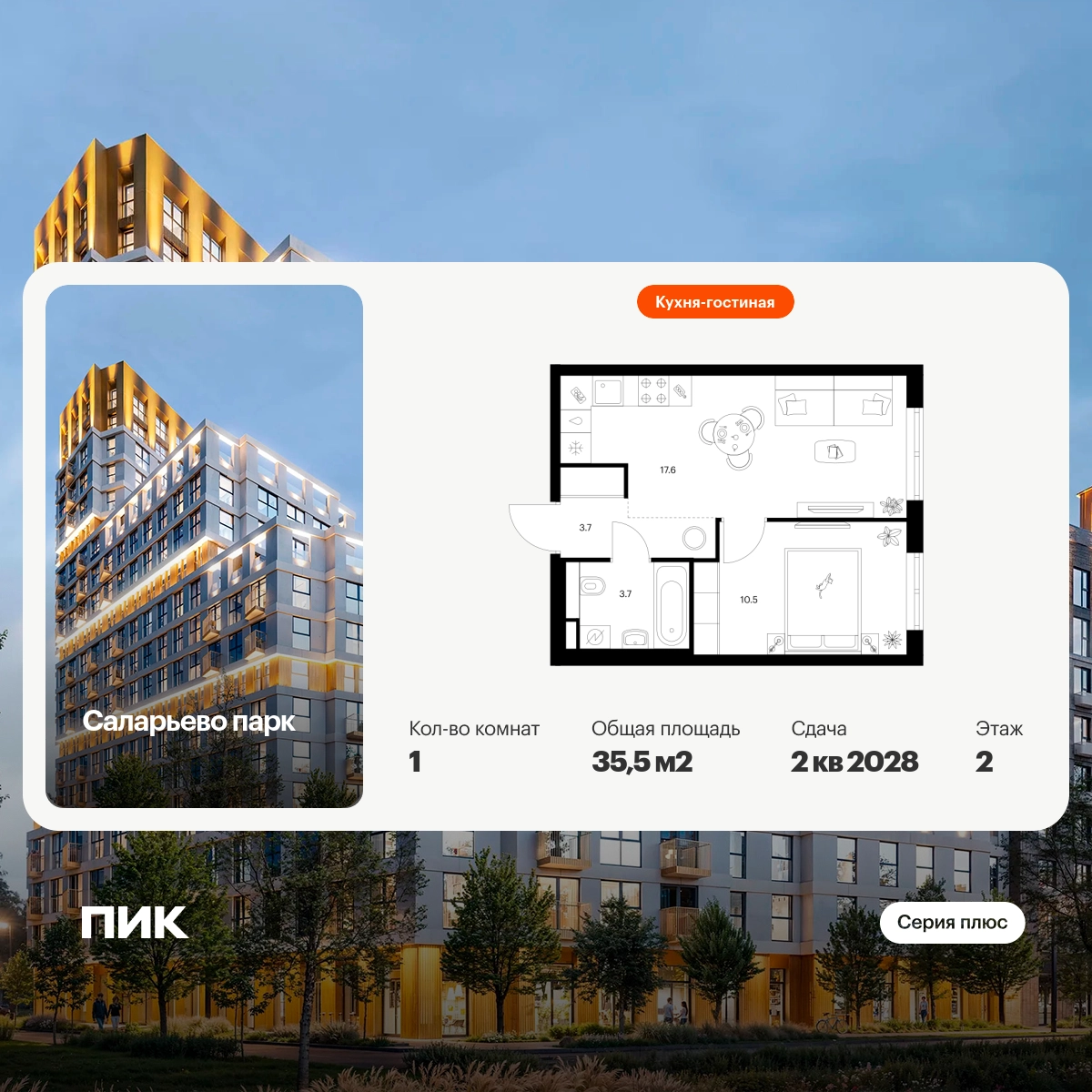 Продаётся 1-комн.квартира площадью 35.50 кв.м на 2 этаже 14 этажного дома (Корпус 57.5, секция 5) проекта ПИК Саларьево парк. Светлый просторный подъезд на уровне земли, функциональная планировка, большие окна, с отделкой. Жилой район «Саларьево парк» расположен в Новой Москве, в четырёх километрах от МКАД по Киевскому шоссе. Две станции метро: «Саларьево» и «Филатов луг», — находятся в пешей доступности от проекта. Дойти до них можно за 5–10 минут. В квартале уже создана качественная среда, где есть абсолютно всё для полноценной жизни, работы и отдыха. «Саларьево парк» — не просто квартал, а полноценный жилой район, который отличается разноплановой архитектурой. Над концепцией квартала работали несколько ведущих архитектурных бюро, которые стремились добиться разнообразия в фасадных решениях. Ярким примером такого подхода станут корпуса 82 и 83, которые относятся к «Серии плюс». Новый корпус 83 был создан по принципам южной архитектуры: расслабленный и лаконичный силуэт зданий, привлекающий к себе внимание. Архитектурная изюминка 83-го корпуса — террасы и фигурные балконы. Вместе с окнами и другими акцентными элементами они создают уникальный облик здания, отсылая нас к изысканной южной архитектуре. Все корпуса в квартале гармонично сочетаются, образуя единую городскую среду. Здесь приятно гулять и проводить время на улице всей семьёй. В «Саларьево парке» создана уникальная образовательная среда, включающая в себя шесть школ, рассчитанных на 6 250 учеников. Четыре из них уже открыты, их посещает 2 300 детей. Также на территории «Саларьево парка» находится 12 детских садов, один из которых с бассейном. Сейчас уже открыты 8 садов. В «Саларьево парке» открыта уникальная игровая площадка — PlayHub «Оригами». Здесь есть ручей, горка-труба и рельефные холмы. Взрослые смогут отдохнуть в уютном кафе, пока дети играют. Также на территории проекта есть SportHub — большая спортивная зона, разделённая по интересам и возрастам. Здесь можно заниматься разными видами спорта: футболом, баскетболом, волейболом и стритболом. Зимой центральную часть площадки превращают в каток. Во дворах-парках жилого квартала есть места для отдыха, детские и спортивные площадки. На первых этажах домов расположены магазины, кафе и полезные сервисы. Также вблизи проекта есть несколько масштабных торговых центров. До ТЦ «Саларис» пять минут пешком, до «Рио», Metro Cash & Carry и «Леруа Мерлен» — пять минут на автомобиле. Артикул - 1018681О застройщике