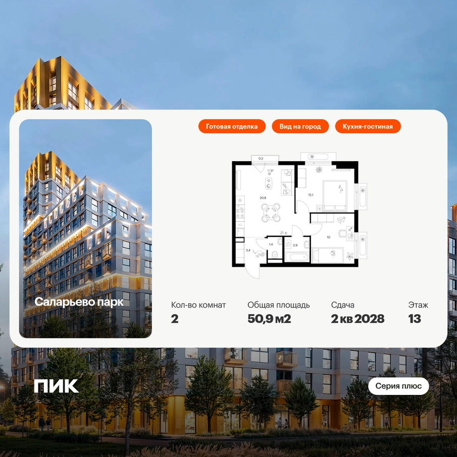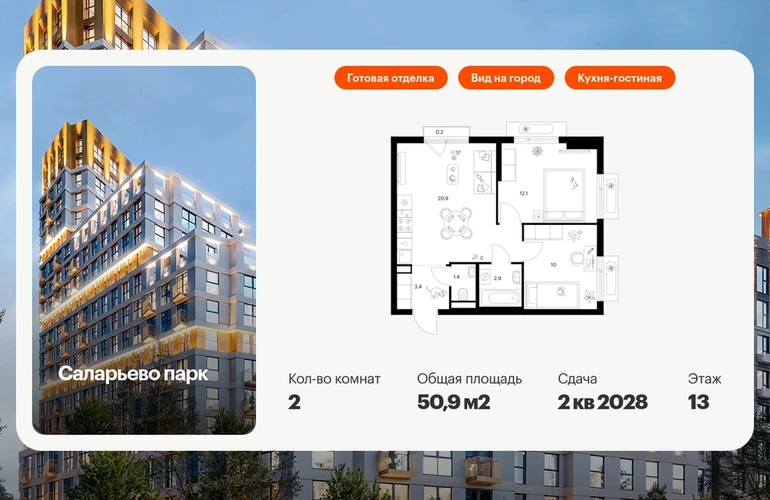 Продаётся 2-комн.квартира площадью 50.90 кв.м на 13 этаже 18 этажного дома (Корпус 74.1, секция 1) проекта ПИК Саларьево парк. Светлый просторный подъезд на уровне земли, функциональная планировка, большие окна, с отделкой. Жилой район «Саларьево парк» расположен в Новой Москве, в четырёх километрах от МКАД по Киевскому шоссе. Две станции метро: «Саларьево» и «Филатов луг», — находятся в пешей доступности от проекта. Дойти до них можно за 5–10 минут. В квартале уже создана качественная среда, где есть абсолютно всё для полноценной жизни, работы и отдыха. «Саларьево парк» — не просто квартал, а полноценный жилой район, который отличается разноплановой архитектурой. Над концепцией квартала работали несколько ведущих архитектурных бюро, которые стремились добиться разнообразия в фасадных решениях. Ярким примером такого подхода станут корпуса 82 и 83, которые относятся к «Серии плюс». Новый корпус 83 был создан по принципам южной архитектуры: расслабленный и лаконичный силуэт зданий, привлекающий к себе внимание. Архитектурная изюминка 83-го корпуса — террасы и фигурные балконы. Вместе с окнами и другими акцентными элементами они создают уникальный облик здания, отсылая нас к изысканной южной архитектуре. Все корпуса в квартале гармонично сочетаются, образуя единую городскую среду. Здесь приятно гулять и проводить время на улице всей семьёй. В «Саларьево парке» создана уникальная образовательная среда, включающая в себя шесть школ, рассчитанных на 6 250 учеников. Четыре из них уже открыты, их посещает 2 300 детей. Также на территории «Саларьево парка» находится 12 детских садов, один из которых с бассейном. Сейчас уже открыты 8 садов. В «Саларьево парке» открыта уникальная игровая площадка — PlayHub «Оригами». Здесь есть ручей, горка-труба и рельефные холмы. Взрослые смогут отдохнуть в уютном кафе, пока дети играют. Также на территории проекта есть SportHub — большая спортивная зона, разделённая по интересам и возрастам. Здесь можно заниматься разными видами спорта: футболом, баскетболом, волейболом и стритболом. Зимой центральную часть площадки превращают в каток. Во дворах-парках жилого квартала есть места для отдыха, детские и спортивные площадки. На первых этажах домов расположены магазины, кафе и полезные сервисы. Также вблизи проекта есть несколько масштабных торговых центров. До ТЦ «Саларис» пять минут пешком, до «Рио», Metro Cash & Carry и «Леруа Мерлен» — пять минут на автомобиле. Артикул - 1006197О застройщике