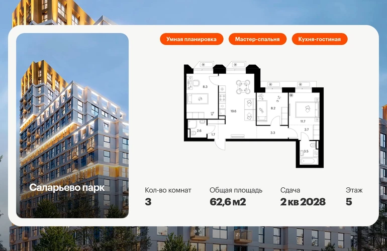 Продаётся 3-комн.квартира площадью 62.60 кв.м на 5 этаже 18 этажного дома (Корпус 74.4, секция 4) проекта ПИК Саларьево парк. Светлый просторный подъезд на уровне земли, функциональная планировка, большие окна, с отделкой. Жилой район «Саларьево парк» расположен в Новой Москве, в четырёх километрах от МКАД по Киевскому шоссе. Две станции метро: «Саларьево» и «Филатов луг», — находятся в пешей доступности от проекта. Дойти до них можно за 5–10 минут. В квартале уже создана качественная среда, где есть абсолютно всё для полноценной жизни, работы и отдыха. «Саларьево парк» — не просто квартал, а полноценный жилой район, который отличается разноплановой архитектурой. Над концепцией квартала работали несколько ведущих архитектурных бюро, которые стремились добиться разнообразия в фасадных решениях. Ярким примером такого подхода станут корпуса 82 и 83, которые относятся к «Серии плюс». Новый корпус 83 был создан по принципам южной архитектуры: расслабленный и лаконичный силуэт зданий, привлекающий к себе внимание. Архитектурная изюминка 83-го корпуса — террасы и фигурные балконы. Вместе с окнами и другими акцентными элементами они создают уникальный облик здания, отсылая нас к изысканной южной архитектуре. Все корпуса в квартале гармонично сочетаются, образуя единую городскую среду. Здесь приятно гулять и проводить время на улице всей семьёй. В «Саларьево парке» создана уникальная образовательная среда, включающая в себя шесть школ, рассчитанных на 6 250 учеников. Четыре из них уже открыты, их посещает 2 300 детей. Также на территории «Саларьево парка» находится 12 детских садов, один из которых с бассейном. Сейчас уже открыты 8 садов. В «Саларьево парке» открыта уникальная игровая площадка — ПлейХаб «Оригами». Здесь есть ручей, горка-труба и рельефные холмы. Взрослые смогут отдохнуть в уютном кафе, пока дети играют. Также на территории проекта есть СпортХаб — большая спортивная зона, разделённая по интересам и возрастам. Здесь можно заниматься разными видами спорта: футболом, баскетболом, волейболом и стритболом. Зимой центральную часть площадки превращают в каток. Во дворах-парках жилого квартала есть места для отдыха, детские и спортивные площадки. На первых этажах домов расположены магазины, кафе и полезные сервисы. Также вблизи проекта есть несколько масштабных торговых центров. До ТЦ «Саларис» пять минут пешком, до «Рио» и «Лемана Про» — пять минут на автомобиле. Артикул - 1006545О застройщике