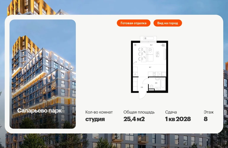 Продаётся квартира-студия площадью 25.40 кв.м на 8 этаже 16 этажного дома (Корпус 74.7, секция 7) проекта ПИК Саларьево парк. Светлый просторный подъезд на уровне земли, функциональная планировка, большие окна, с отделкой. Жилой район «Саларьево парк» расположен в Новой Москве, в четырёх километрах от МКАД по Киевскому шоссе. Две станции метро: «Саларьево» и «Филатов луг», — находятся в пешей доступности от проекта. Дойти до них можно за 5–10 минут. В квартале уже создана качественная среда, где есть абсолютно всё для полноценной жизни, работы и отдыха. «Саларьево парк» — не просто квартал, а полноценный жилой район, который отличается разноплановой архитектурой. Над концепцией квартала работали несколько ведущих архитектурных бюро, которые стремились добиться разнообразия в фасадных решениях. Ярким примером такого подхода станут корпуса 82 и 83, которые относятся к «Серии плюс». Новый корпус 83 был создан по принципам южной архитектуры: расслабленный и лаконичный силуэт зданий, привлекающий к себе внимание. Архитектурная изюминка 83-го корпуса — террасы и фигурные балконы. Вместе с окнами и другими акцентными элементами они создают уникальный облик здания, отсылая нас к изысканной южной архитектуре. Все корпуса в квартале гармонично сочетаются, образуя единую городскую среду. Здесь приятно гулять и проводить время на улице всей семьёй. В «Саларьево парке» создана уникальная образовательная среда, включающая в себя шесть школ, рассчитанных на 6 250 учеников. Четыре из них уже открыты, их посещает 2 300 детей. Также на территории «Саларьево парка» находится 12 детских садов, один из которых с бассейном. Сейчас уже открыты 8 садов. В «Саларьево парке» открыта уникальная игровая площадка — PlayHub «Оригами». Здесь есть ручей, горка-труба и рельефные холмы. Взрослые смогут отдохнуть в уютном кафе, пока дети играют. Также на территории проекта есть SportHub — большая спортивная зона, разделённая по интересам и возрастам. Здесь можно заниматься разными видами спорта: футболом, баскетболом, волейболом и стритболом. Зимой центральную часть площадки превращают в каток. Во дворах-парках жилого квартала есть места для отдыха, детские и спортивные площадки. На первых этажах домов расположены магазины, кафе и полезные сервисы. Также вблизи проекта есть несколько масштабных торговых центров. До ТЦ «Саларис» пять минут пешком, до «Рио», Metro Cash & Carry и «Леруа Мерлен» — пять минут на автомобиле. Артикул - 1007059О застройщике
