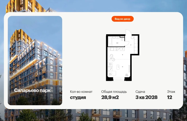 Продаётся квартира-студия площадью 28.90 кв.м на 12 этаже 23 этажного дома (Корпус 69.1, секция 1) проекта ПИК Саларьево парк. Светлый просторный подъезд на уровне земли, функциональная планировка, большие окна, с отделкой. Жилой район «Саларьево парк» расположен в Новой Москве, в четырёх километрах от МКАД по Киевскому шоссе. Две станции метро: «Саларьево» и «Филатов луг», — находятся в пешей доступности от проекта. Дойти до них можно за 5–10 минут. В квартале уже создана качественная среда, где есть абсолютно всё для полноценной жизни, работы и отдыха. «Саларьево парк» — не просто квартал, а полноценный жилой район, который отличается разноплановой архитектурой. Над концепцией квартала работали несколько ведущих архитектурных бюро, которые стремились добиться разнообразия в фасадных решениях. Ярким примером такого подхода станут корпуса 82 и 83, которые относятся к «Серии плюс». Новый корпус 83 был создан по принципам южной архитектуры: расслабленный и лаконичный силуэт зданий, привлекающий к себе внимание. Архитектурная изюминка 83-го корпуса — террасы и фигурные балконы. Вместе с окнами и другими акцентными элементами они создают уникальный облик здания, отсылая нас к изысканной южной архитектуре. Все корпуса в квартале гармонично сочетаются, образуя единую городскую среду. Здесь приятно гулять и проводить время на улице всей семьёй. В «Саларьево парке» создана уникальная образовательная среда, включающая в себя шесть школ, рассчитанных на 6 250 учеников. Четыре из них уже открыты, их посещает 2 300 детей. Также на территории «Саларьево парка» находится 12 детских садов, один из которых с бассейном. Сейчас уже открыты 8 садов. В «Саларьево парке» открыта уникальная игровая площадка — ПлейХаб «Оригами». Здесь есть ручей, горка-труба и рельефные холмы. Взрослые смогут отдохнуть в уютном кафе, пока дети играют. Также на территории проекта есть СпортХаб — большая спортивная зона, разделённая по интересам и возрастам. Здесь можно заниматься разными видами спорта: футболом, баскетболом, волейболом и стритболом. Зимой центральную часть площадки превращают в каток. Во дворах-парках жилого квартала есть места для отдыха, детские и спортивные площадки. На первых этажах домов расположены магазины, кафе и полезные сервисы. Также вблизи проекта есть несколько масштабных торговых центров. До ТЦ «Саларис» пять минут пешком, до «Рио» и «Лемана Про» — пять минут на автомобиле. Артикул - 1023315О застройщике