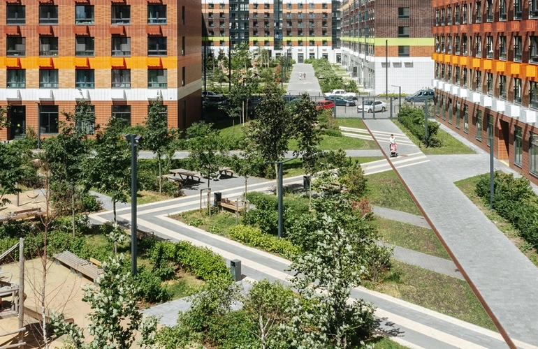 В проекте есть вся необходимая инфраструктура для комфортной жизни: три школы, семь детских садов и поликлиника. Между домами проходит пешеходный бульвар, где можно кататься на велосипеде, гулять и отдыхать от городской суеты. В зелёных дворах без автомобилей — детские площадки и места для отдыха. Для детей разного возраста есть большая игровая площадка PlayHub «Остров». На первых этажах откроются магазины, кафе и другие сервисы, а на подземных этажах — паркинги.