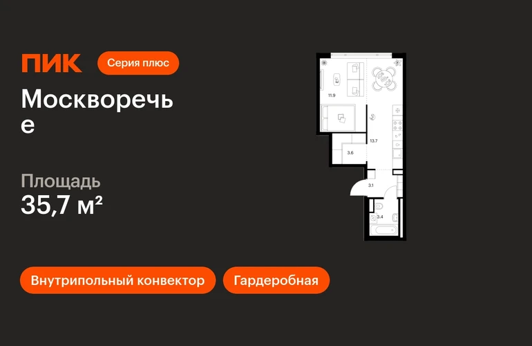 В районе Москворечье-Сабурово продаётся 1-комнатная квартира квартира площадью 35.7 кв. м на 10 этаже 29 этажного дома (корпус, секция) в проекте ПИК «Москворечье». Удобное расположение 18 минут пешком до станции метро «Каширская» и 19 минут до метро «Чертановская». 1 минута на автомобиле до ЮВХ, 13 минут до ТТК и 15 минут до МКАД. 15 минут пешком до ТРК «Москворечье» и 27 минут до ТДЦ «Варшавский». 16 минут пешком до «Долины реки Чертановки» и 30 минут до парка «Коломенское». Особенности проекта «Москворечье» — масштабный проект с авторской архитектурой в Москворечье-Сабурово. Здесь создана качественная среда для полноценной жизни, работы и отдыха. А удобные и разнообразные планировки позволят каждому выбрать квартиру для собственного сценария жизни. Преимущества проекта: Отделка: Готовая Особенности планировки: Гардеробная, Широкие окна, Внутрипольные конвекторы, Умная планировка Дизайнерские лобби с быстрыми и тихими лифтами, зонами ожидания и колясочными. Два детсада на 350 мест каждый, школа на 1350 мест и поликлиника на территории проекта. Пешеходный бульвар с местами для отдыха, игровыми и спортивными площадками. Первые этажи с пешеходными галереями, магазинами, кафе и полезными сервисами. Подземный паркинг для автомобилей и мотоциклов. Артикул _О застройщике
