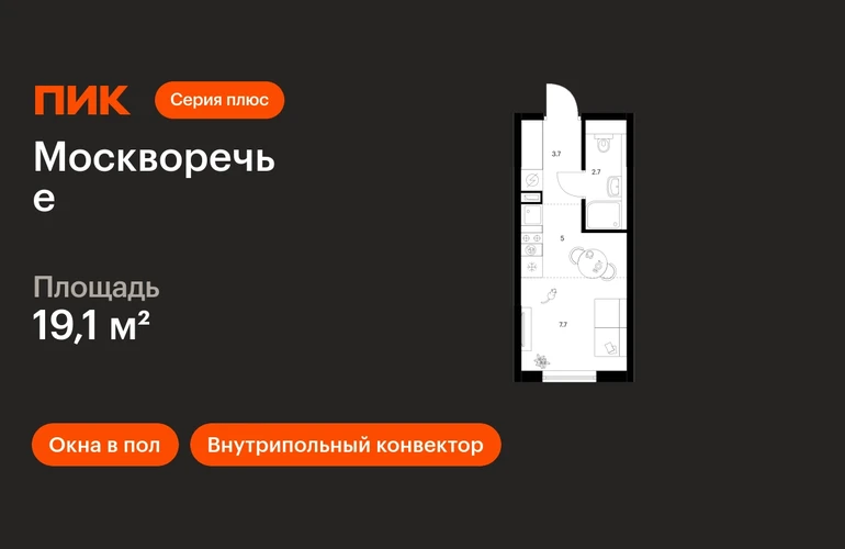 В районе Москворечье-Сабурово продаётся студия квартира площадью 19.1 кв. м на 16 этаже 17 этажного дома (корпус, секция) в проекте ПИК «Москворечье». Удобное расположение 18 минут пешком до станции метро «Каширская» и 19 минут до метро «Чертановская». 1 минута на автомобиле до ЮВХ, 13 минут до ТТК и 15 минут до МКАД. 15 минут пешком до ТРК «Москворечье» и 27 минут до ТДЦ «Варшавский». 16 минут пешком до «Долины реки Чертановки» и 30 минут до парка «Коломенское». Особенности проекта «Москворечье» — масштабный проект с авторской архитектурой в Москворечье-Сабурово. Здесь создана качественная среда для полноценной жизни, работы и отдыха. А удобные и разнообразные планировки позволят каждому выбрать квартиру для собственного сценария жизни. Преимущества проекта: Отделка: Готовая Особенности планировки: Окна в пол, Внутрипольные конвекторы Дизайнерские лобби с быстрыми и тихими лифтами, зонами ожидания и колясочными. Два детсада на 350 мест каждый, школа на 1350 мест и поликлиника на территории проекта. Пешеходный бульвар с местами для отдыха, игровыми и спортивными площадками. Первые этажи с пешеходными галереями, магазинами, кафе и полезными сервисами. Подземный паркинг для автомобилей и мотоциклов. Артикул _О застройщике