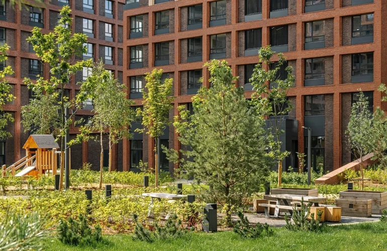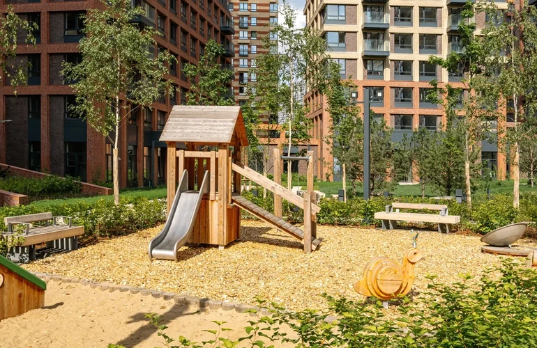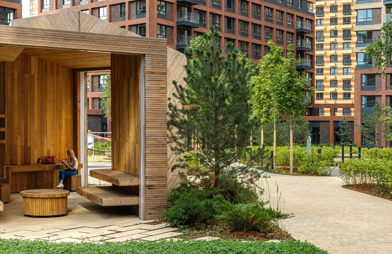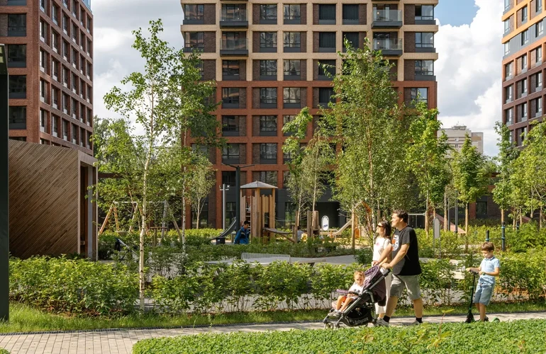 Проект состоит из домов высотой от 9 до 21 этажей и уютных дворов-парков. На подземных этажах предусмотрены паркинги с велостоянкой и зарядками для электромобилей, а также вместительные кладовые. В светлых и просторных лобби будут комнаты для колясок и лапомойка для собак.