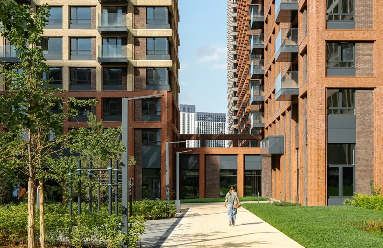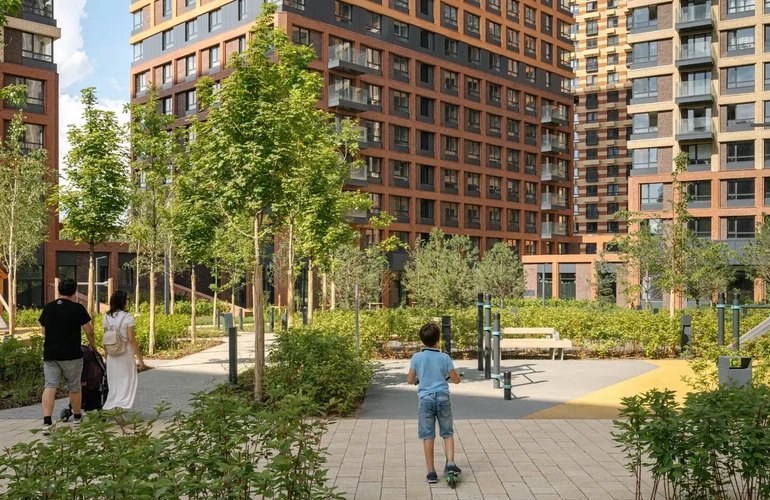 Уже открыта часть пешеходного бульвара, который строится по проекту британского бюро Gillespies. Здесь можно гулять после работы, играть с детьми, заниматься спортом и отдыхать у сухого фонтана с ночной подсветкой. В будущем в кластере появится пешеходный мост, который соединит жилые кварталы.