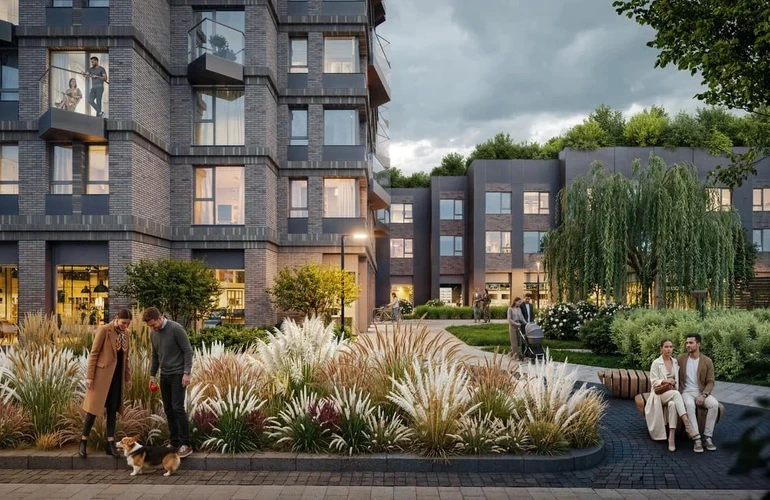 Архитектура квартала органично вписывается в окружающий ландшафт. В отделке используются натуральные материалы и спокойные цвета, которые дополняют природные пространства вокруг квартала.