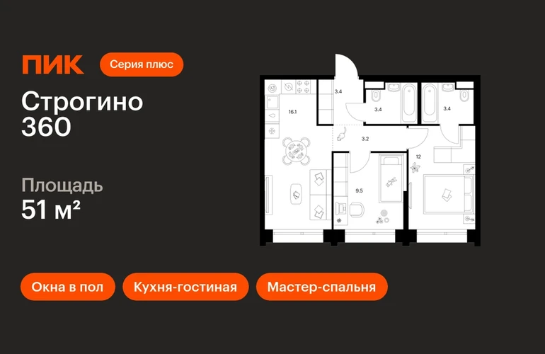 Продаётся 2-комн.квартира площадью 51.00 кв.м на 20 этаже 30 этажного дома (Корпус 1.2, секция 1) проекта ПИК Строгино 360. Светлый просторный подъезд на уровне земли, функциональная планировка, большие окна, с отделкой. «Строгино 360» — флагманский проект ПИК в 20 минутах от центра Москвы, в одном из самых экологичных районов столицы. В 2027 году — к моменту заселения первых домов — в 10 минутах пешком от проекта откроется станция метро «Липовая роща». В квартале всё настроено на 360 градусов: квартиры с террасами и панорамными видами на лес и воду, спорт — от йоги до яхтинга — и деловой кластер, где будет создана комфортная среда для работы и бизнеса. Всего в 10 минутах от проекта расположен ТЦ «Вегас Сити» с десятками магазинов в интерьерах городских улиц, каток, кинотеатр, рестораны и аттракционы. Архитектура и гранд-лобби Архитектура квартала органично вписывается в окружающий ландшафт. В отделке используются натуральные материалы и спокойные цвета, которые дополняют природные пространства вокруг квартала. Специально для «Строгино 360» бюро разработало авторский дизайн гранд-лобби, где можно встретиться с близкими или партнёрами, поработать или поиграть с детьми. Для этого здесь появятся коворкинг, ресепшен, пространства для отдыха, игровая для детей и гостевой санузел. Инфраструктура проекта «Строгино 360» — больше чем жилой квартал. Здесь создана вся необходимая инфраструктура для комфортной и насыщенной жизни. Главной артерией станет пешеходный бульвар, длиной 3,4 км — с магазинами, кафе и продуманными пространствами для спорта и отдыха. Для детей в партнёрстве с «Фондом развития Физтех-школ» при поддержке МФТИ мы построим образовательный центр. Планировки В доминанте проекта — корпусе 1.2 — вы найдёте квартиры с террасами и живописными видами на на Москву-реку, Строгинский затон и Серебряный Бор. А в малоэтажных корпусах 1.1.1–1.1.3 создана уютная камерная атмосфера благодаря небольшому количеству квартир на этаже. Также здесь вы можете выбрать квартиру с системой умного дома. Артикул - 1052290О застройщике
