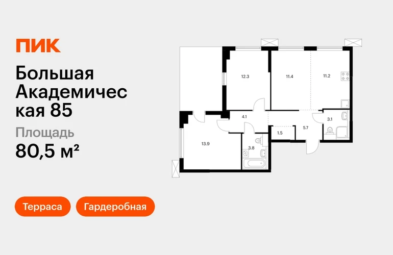 В Тимирязевском районе продаётся 3-комнатный апартамент квартира площадью 80.5 на 22 этаже 24 этажного дома (корпус, секция) в проекте ПИК «Большая Академическая 85». Удобное расположение 11 минут пешком до станции метро «Окружная». 11 минут пешком до станции МЦК «Лихоборы». 1 минута на автомобиле до СВХ, 9 минут до МКАД и 14 минут до ТТК. 30 минут пешком до Ботанического сада. Особенности проекта «Большая Академическая 85» — квартал ПИК в тихом и зелёном Тимирязевском районе Москвы. Проект, где собраны лучшие архитектурные и планировочные решения ПИК, состоит из домов переменной высоты от 11 до 24 этажей. Преимущества проекта: Отделка: Просторные и светлые холлы с быстрыми и тихими лифтами. Детский сад с начальной школой. Local Play — большое игровое пространство для детей. Подземный паркинг. АртикулО застройщике