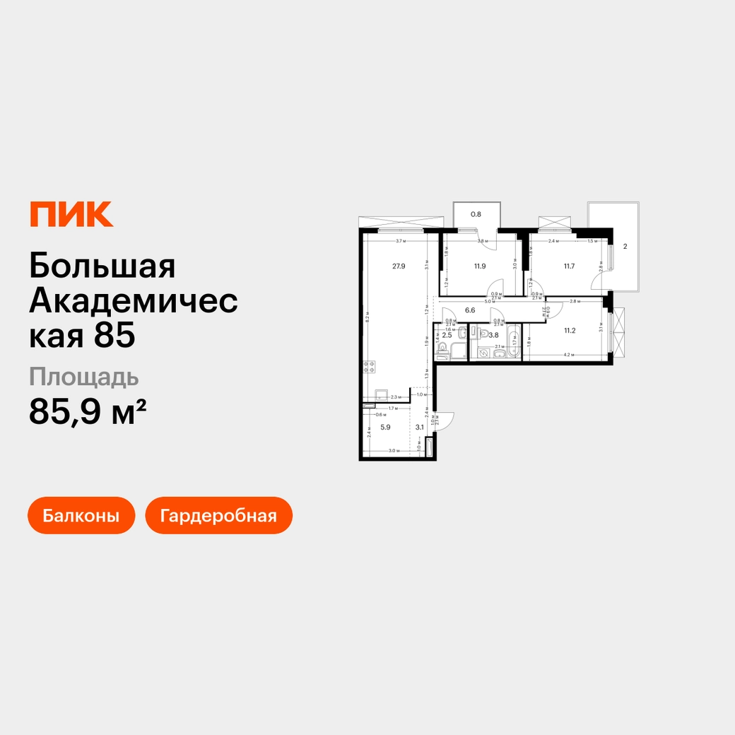 В Тимирязевском районе продаётся 3-комнатная квартира квартира площадью 85.9 на 5 этаже 24 этажного дома (корпус, секция) в проекте ПИК «Большая Академическая 85». Удобное расположение 11 минут пешком до станции метро «Окружная». 11 минут пешком до станции МЦК «Лихоборы». 1 минута на автомобиле до СВХ, 9 минут до МКАД и 14 минут до ТТК. 30 минут пешком до Ботанического сада. Особенности проекта «Большая Академическая 85» — квартал ПИК в тихом и зелёном Тимирязевском районе Москвы. Проект, где собраны лучшие архитектурные и планировочные решения ПИК, состоит из домов переменной высоты от 11 до 24 этажей. Преимущества проекта: Отделка: Просторные и светлые холлы с быстрыми и тихими лифтами. Детский сад с начальной школой. Local Play — большое игровое пространство для детей. Подземный паркинг. АртикулО застройщике