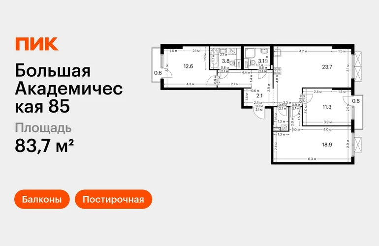 В Тимирязевском районе продаётся 3-комнатная квартира квартира площадью 83.7 на 5 этаже 14 этажного дома (корпус, секция) в проекте ПИК «Большая Академическая 85». Удобное расположение 11 минут пешком до станции метро «Окружная». 11 минут пешком до станции МЦК «Лихоборы». 1 минута на автомобиле до СВХ, 9 минут до МКАД и 14 минут до ТТК. 30 минут пешком до Ботанического сада. Особенности проекта «Большая Академическая 85» — квартал ПИК в тихом и зелёном Тимирязевском районе Москвы. Проект, где собраны лучшие архитектурные и планировочные решения ПИК, состоит из домов переменной высоты от 11 до 24 этажей. Преимущества проекта: Отделка: Просторные и светлые холлы с быстрыми и тихими лифтами. Детский сад с начальной школой. Local Play — большое игровое пространство для детей. Подземный паркинг. АртикулО застройщике