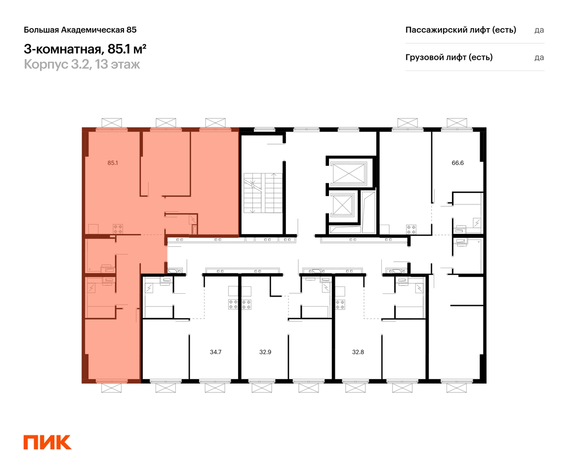 В Тимирязевском районе продаётся 3-комнатная квартира квартира площадью 83.3 на 13 этаже 14 этажного дома (корпус, секция) в проекте ПИК «Большая Академическая 85». Удобное расположение 11 минут пешком до станции метро «Окружная». 11 минут пешком до станции МЦК «Лихоборы». 1 минута на автомобиле до СВХ, 9 минут до МКАД и 14 минут до ТТК. 30 минут пешком до Ботанического сада. Особенности проекта «Большая Академическая 85» — квартал ПИК в тихом и зелёном Тимирязевском районе Москвы. Проект, где собраны лучшие архитектурные и планировочные решения ПИК, состоит из домов переменной высоты от 11 до 24 этажей. Преимущества проекта: Отделка: Просторные и светлые холлы с быстрыми и тихими лифтами. Детский сад с начальной школой. Local Play — большое игровое пространство для детей. Подземный паркинг. АртикулО застройщике