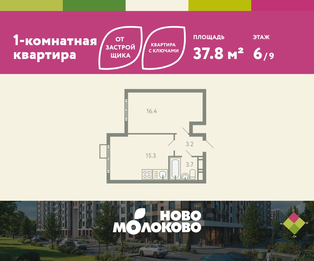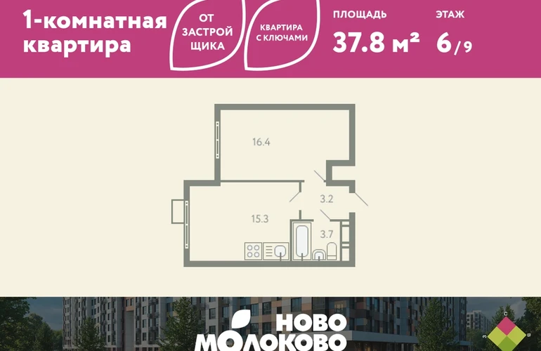 КВАРТИРА С КЛЮЧАМИ! Продается 1-комнатная квартира в ЖК «Ново-молоково» на 6 этаже, секция 10, площадью 37.80 кв. м. Квартира предчистовой отделкой. Жилой комплекс «Ново-молоково» расположен в экологическом районе ближнего Подмосковья всего в 20 минутах транспортом от метро «Домодедовская». Инфраструктура: - быстрый съезд на Каширское шоссе в сторону Москвы, 20 минут до м. «Домодедовская»; - прямой автобус №367 от ЖК до метро «Домодедовская»; - благоустроенная территория комплекса с прогулочным бульваром, организованными спортивными и детскими площадками; - на территории работают 2 детских сада. Рядом открыта школа с классами «Физтех XXI» от Фонда развития Физтех-школ Московского физико-технического института; - планируется строительство многоуровневой и плоскостной парковки на территории ЖК; - рядом: клуб семейного отдыха, фитнес-центр, горнолыжный курорт, заповедник Горки Ленинские, конно-спортивный комплекс, пляж загородного клуба “Молоково” и другие центры притяжения. Застройка не выше 12 этажей — позволяет сохранить комфортный климат микрорайона, избежав ощущения «каменных джунглей». Свободные планировки, высокие потолки и панорамное остекление отражают современный дизайн комплекса, который также прослеживается и в обустройстве общественных пространств: дворов, игровых площадок и подъездов. В «Ново-Молоково» реализована концепция «двор без машин», что создает дополнительную безопасность для детей и комфорт для жителей. Для автомобилистов организован комфортный наземный паркинг. Успейте приобрести квартиру на выгодных условиях! Чтобы узнать подробности, обращайтесь за консультацией по телефону!О застройщике