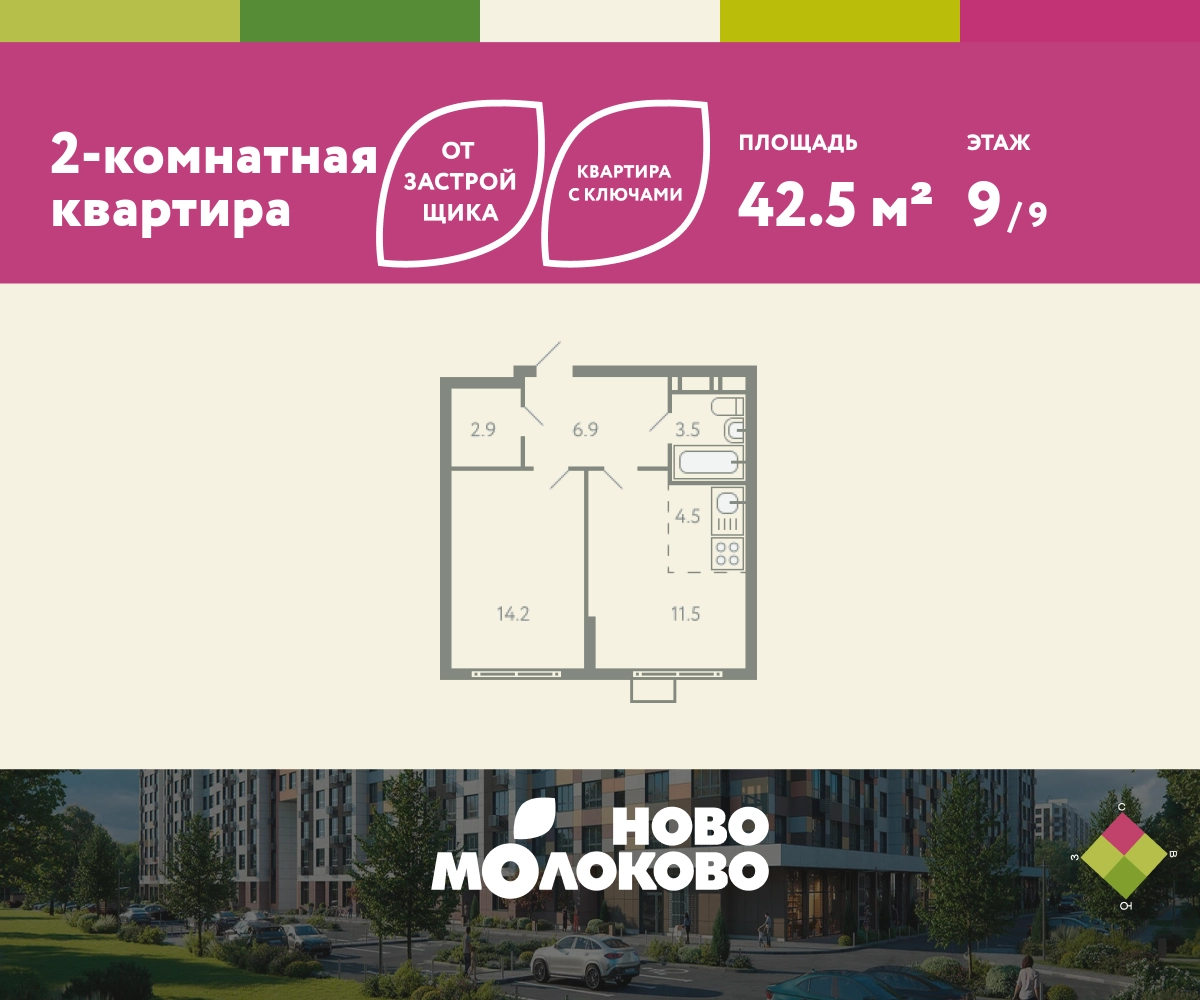 КВАРТИРА С КЛЮЧАМИ! Продается 2-комнатная квартира евроформата в ЖК «Ново-молоково» на 9 этаже, секция 14, площадью 42.50 кв. м. Квартира предчистовой отделкой. Жилой комплекс «Ново-молоково» расположен в экологическом районе ближнего Подмосковья всего в 20 минутах транспортом от метро «Домодедовская». Инфраструктура: - быстрый съезд на Каширское шоссе в сторону Москвы, 20 минут до м. «Домодедовская»; - прямой автобус №367 от ЖК до метро «Домодедовская»; - благоустроенная территория комплекса с прогулочным бульваром, организованными спортивными и детскими площадками; - на территории работают 2 детских сада. Рядом открыта школа с классами «Физтех XXI» от Фонда развития Физтех-школ Московского физико-технического института; - планируется строительство многоуровневой и плоскостной парковки на территории ЖК; - рядом: клуб семейного отдыха, фитнес-центр, горнолыжный курорт, заповедник Горки Ленинские, конно-спортивный комплекс, пляж загородного клуба “Молоково” и другие центры притяжения. Застройка не выше 12 этажей — позволяет сохранить комфортный климат микрорайона, избежав ощущения «каменных джунглей». Свободные планировки, высокие потолки и панорамное остекление отражают современный дизайн комплекса, который также прослеживается и в обустройстве общественных пространств: дворов, игровых площадок и подъездов. В «Ново-Молоково» реализована концепция «двор без машин», что создает дополнительную безопасность для детей и комфорт для жителей. Для автомобилистов организован комфортный наземный паркинг. Успейте приобрести квартиру на выгодных условиях! Чтобы узнать подробности, обращайтесь за консультацией по телефону!О застройщике