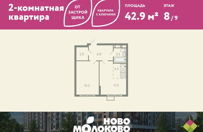КВАРТИРА С КЛЮЧАМИ! Продается 2-комнатная квартира евроформата в ЖК «Ново-молоково» на 8 этаже, секция 5, площадью 42.90 кв. м. Квартира предчистовой отделкой. Жилой комплекс «Ново-молоково» расположен в экологическом районе ближнего Подмосковья всего в 20 минутах транспортом от метро «Домодедовская». Инфраструктура: - быстрый съезд на Каширское шоссе в сторону Москвы, 20 минут до м. «Домодедовская»; - прямой автобус №367 от ЖК до метро «Домодедовская»; - благоустроенная территория комплекса с прогулочным бульваром, организованными спортивными и детскими площадками; - на территории работают 2 детских сада. Рядом открыта школа с классами «Физтех XXI» от Фонда развития Физтех-школ Московского физико-технического института; - планируется строительство многоуровневой и плоскостной парковки на территории ЖК; - рядом: клуб семейного отдыха, фитнес-центр, горнолыжный курорт, заповедник Горки Ленинские, конно-спортивный комплекс, пляж загородного клуба “Молоково” и другие центры притяжения. Застройка не выше 12 этажей — позволяет сохранить комфортный климат микрорайона, избежав ощущения «каменных джунглей». Свободные планировки, высокие потолки и панорамное остекление отражают современный дизайн комплекса, который также прослеживается и в обустройстве общественных пространств: дворов, игровых площадок и подъездов. В «Ново-Молоково» реализована концепция «двор без машин», что создает дополнительную безопасность для детей и комфорт для жителей. Для автомобилистов организован комфортный наземный паркинг. Успейте приобрести квартиру на выгодных условиях! Чтобы узнать подробности, обращайтесь за консультацией по телефону!О застройщике