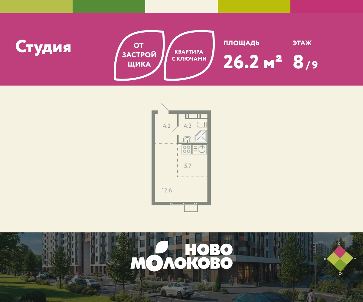 КВАРТИРА С КЛЮЧАМИ! Продается студия в ЖК «Ново-молоково» на 8 этаже, секция 13, площадью 26.20 кв. м. Квартира предчистовой отделкой. Жилой комплекс «Ново-молоково» расположен в экологическом районе ближнего Подмосковья всего в 20 минутах транспортом от метро «Домодедовская». Инфраструктура: - быстрый съезд на Каширское шоссе в сторону Москвы, 20 минут до м. «Домодедовская»; - прямой автобус №367 от ЖК до метро «Домодедовская»; - благоустроенная территория комплекса с прогулочным бульваром, организованными спортивными и детскими площадками; - на территории работают 2 детских сада. Рядом открыта школа с классами «Физтех XXI» от Фонда развития Физтех-школ Московского физико-технического института; - планируется строительство многоуровневой и плоскостной парковки на территории ЖК; - рядом: клуб семейного отдыха, фитнес-центр, горнолыжный курорт, заповедник Горки Ленинские, конно-спортивный комплекс, пляж загородного клуба “Молоково” и другие центры притяжения. Застройка не выше 12 этажей — позволяет сохранить комфортный климат микрорайона, избежав ощущения «каменных джунглей». Свободные планировки, высокие потолки и панорамное остекление отражают современный дизайн комплекса, который также прослеживается и в обустройстве общественных пространств: дворов, игровых площадок и подъездов. В «Ново-Молоково» реализована концепция «двор без машин», что создает дополнительную безопасность для детей и комфорт для жителей. Для автомобилистов организован комфортный наземный паркинг. Успейте приобрести квартиру на выгодных условиях! Чтобы узнать подробности, обращайтесь за консультацией по телефону!О застройщике