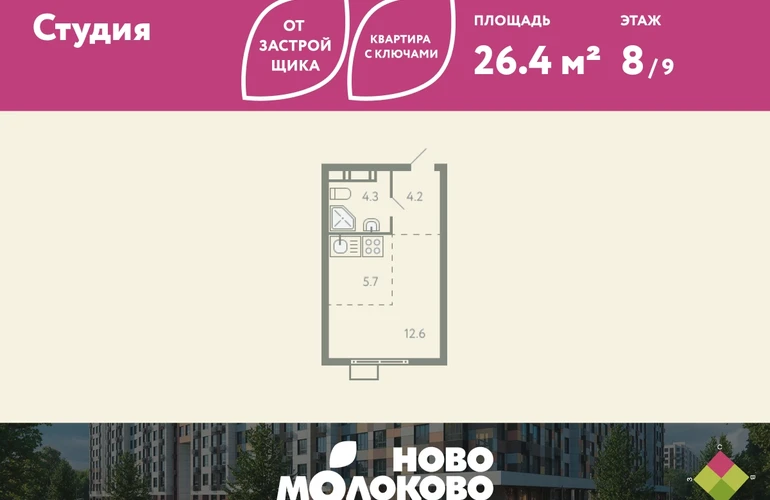 КВАРТИРА С КЛЮЧАМИ! Продается студия в ЖК «Ново-молоково» на 8 этаже, секция 18, площадью 26.40 кв. м. Квартира предчистовой отделкой. Жилой комплекс «Ново-молоково» расположен в экологическом районе ближнего Подмосковья всего в 20 минутах транспортом от метро «Домодедовская». Инфраструктура: - быстрый съезд на Каширское шоссе в сторону Москвы, 20 минут до м. «Домодедовская»; - прямой автобус №367 от ЖК до метро «Домодедовская»; - благоустроенная территория комплекса с прогулочным бульваром, организованными спортивными и детскими площадками; - на территории работают 2 детских сада. Рядом открыта школа с классами «Физтех XXI» от Фонда развития Физтех-школ Московского физико-технического института; - планируется строительство многоуровневой и плоскостной парковки на территории ЖК; - рядом: клуб семейного отдыха, фитнес-центр, горнолыжный курорт, заповедник Горки Ленинские, конно-спортивный комплекс, пляж загородного клуба “Молоково” и другие центры притяжения. Застройка не выше 12 этажей — позволяет сохранить комфортный климат микрорайона, избежав ощущения «каменных джунглей». Свободные планировки, высокие потолки и панорамное остекление отражают современный дизайн комплекса, который также прослеживается и в обустройстве общественных пространств: дворов, игровых площадок и подъездов. В «Ново-Молоково» реализована концепция «двор без машин», что создает дополнительную безопасность для детей и комфорт для жителей. Для автомобилистов организован комфортный наземный паркинг. Успейте приобрести квартиру на выгодных условиях! Чтобы узнать подробности, обращайтесь за консультацией по телефону!О застройщике