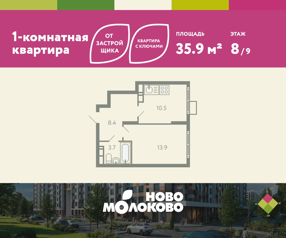 КВАРТИРА С КЛЮЧАМИ! Продается 1-комнатная квартира в ЖК «Ново-молоково» на 8 этаже, секция 10, площадью 35.90 кв. м. Квартира предчистовой отделкой. Жилой комплекс «Ново-молоково» расположен в экологическом районе ближнего Подмосковья всего в 20 минутах транспортом от метро «Домодедовская». Инфраструктура: - быстрый съезд на Каширское шоссе в сторону Москвы, 20 минут до м. «Домодедовская»; - прямой автобус №367 от ЖК до метро «Домодедовская»; - благоустроенная территория комплекса с прогулочным бульваром, организованными спортивными и детскими площадками; - на территории работают 2 детских сада. Рядом открыта школа с классами «Физтех XXI» от Фонда развития Физтех-школ Московского физико-технического института; - планируется строительство многоуровневой и плоскостной парковки на территории ЖК; - рядом: клуб семейного отдыха, фитнес-центр, горнолыжный курорт, заповедник Горки Ленинские, конно-спортивный комплекс, пляж загородного клуба “Молоково” и другие центры притяжения. Застройка не выше 12 этажей — позволяет сохранить комфортный климат микрорайона, избежав ощущения «каменных джунглей». Свободные планировки, высокие потолки и панорамное остекление отражают современный дизайн комплекса, который также прослеживается и в обустройстве общественных пространств: дворов, игровых площадок и подъездов. В «Ново-Молоково» реализована концепция «двор без машин», что создает дополнительную безопасность для детей и комфорт для жителей. Для автомобилистов организован комфортный наземный паркинг. Успейте приобрести квартиру на выгодных условиях! Чтобы узнать подробности, обращайтесь за консультацией по телефону!О застройщике