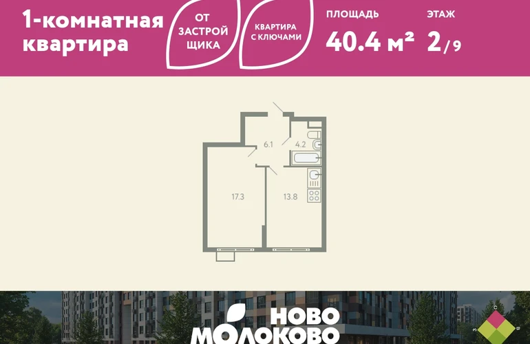 КВАРТИРА С КЛЮЧАМИ! Продается 1-комнатная квартира в ЖК «Ново-молоково» на 2 этаже, секция 7, площадью 40.40 кв. м. Квартира предчистовой отделкой. Жилой комплекс «Ново-молоково» расположен в экологическом районе ближнего Подмосковья всего в 20 минутах транспортом от метро «Домодедовская». Инфраструктура: - быстрый съезд на Каширское шоссе в сторону Москвы, 20 минут до м. «Домодедовская»; - прямой автобус №367 от ЖК до метро «Домодедовская»; - благоустроенная территория комплекса с прогулочным бульваром, организованными спортивными и детскими площадками; - на территории работают 2 детских сада. Рядом открыта школа с классами «Физтех XXI» от Фонда развития Физтех-школ Московского физико-технического института; - планируется строительство многоуровневой и плоскостной парковки на территории ЖК; - рядом: клуб семейного отдыха, фитнес-центр, горнолыжный курорт, заповедник Горки Ленинские, конно-спортивный комплекс, пляж загородного клуба “Молоково” и другие центры притяжения. Застройка не выше 12 этажей — позволяет сохранить комфортный климат микрорайона, избежав ощущения «каменных джунглей». Свободные планировки, высокие потолки и панорамное остекление отражают современный дизайн комплекса, который также прослеживается и в обустройстве общественных пространств: дворов, игровых площадок и подъездов. В «Ново-Молоково» реализована концепция «двор без машин», что создает дополнительную безопасность для детей и комфорт для жителей. Для автомобилистов организован комфортный наземный паркинг. Успейте приобрести квартиру на выгодных условиях! Чтобы узнать подробности, обращайтесь за консультацией по телефону!О застройщике