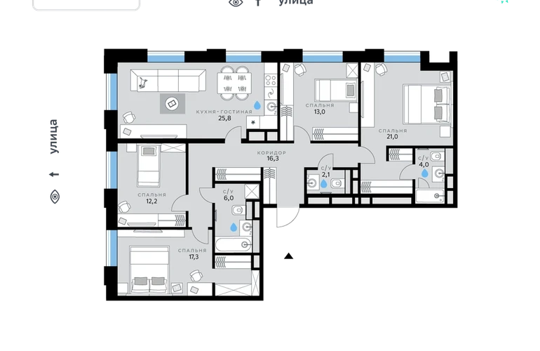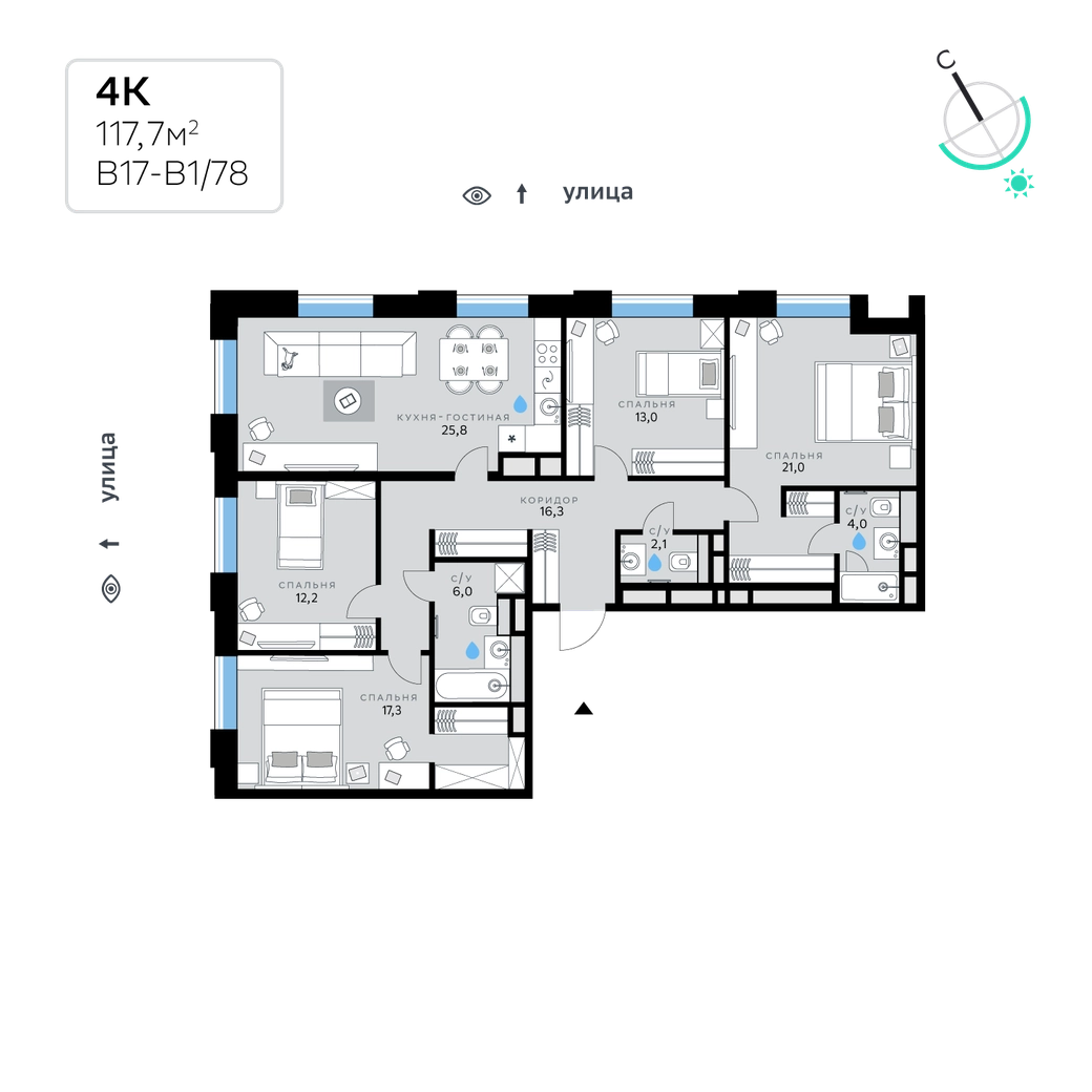 В продаже — четырехкомнатная квартира с чистовой отделкой, общей площадью 117,7 кв. м. Квартира расположена на восьмом этаже шестиэтажного корпуса класса Балансд в квартале В17 нового района СберСити, который строит Сбер. Всего в доме — 102 квартиры.Архитектуру корпусов квартала разработало итальянское бюро. В облике В17 читаются черты современной голландской архитектуры: фасады домов класса Балансд облицованы ярким кирпичом и клинкерной плиткой, над первым этажом проходит декоративный пояс из фигурной кладки. Французские балкончики чередуются с широкими окнами, создавая гармоничный ритм. Во дворах — ландшафтные композиции, детские и спортивные площадки, зона для йоги, прогулочные дорожки и места отдыха. Рядом расположены детский сад, парк и набережная Москвы-реки.