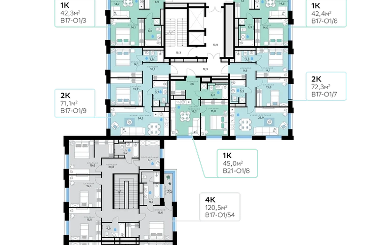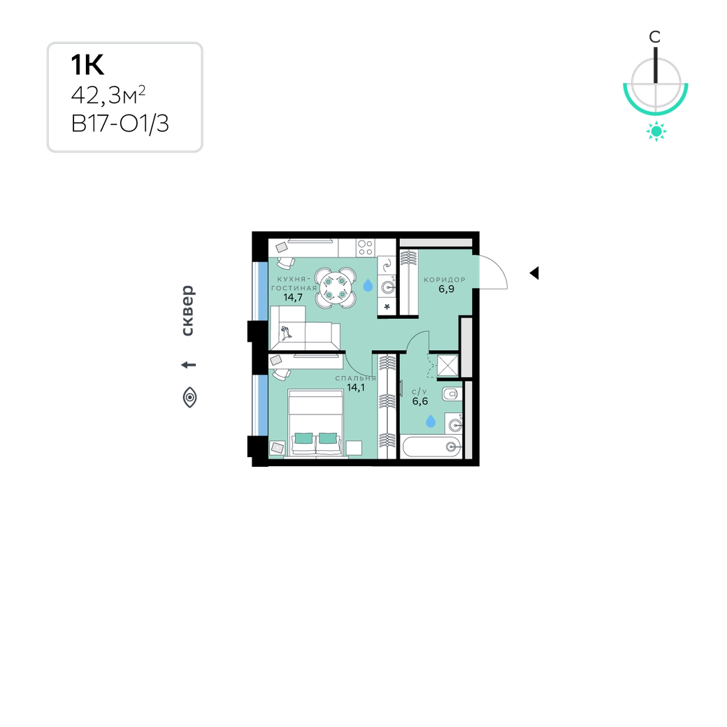 В продаже — однокомнатная квартира, общей площадью 42,3 кв. м. Квартира расположена на втором этаже десятиэтажного дома класса Оптимум в квартале В17 нового района СберСити, который строит Сбер. Всего в доме — 55 квартир.Квартал В17 — современная интерпретация голландской архитектуры. Каждый корпус имеет индивидуальный облик. В домах класса Оптимум используется лаконичная крупноформатная облицовка стеклофибробетоном и декоративными металлическими панелями. На верхних этажах расположены квартиры с панорамным остеклением и террасами, с которых открываются виды на город, парки и бульвар.