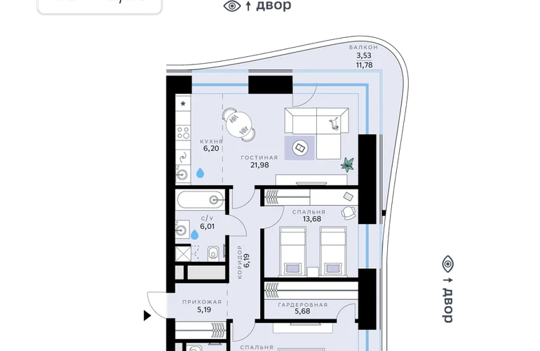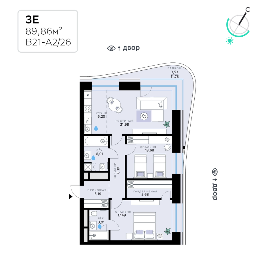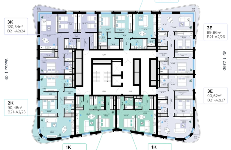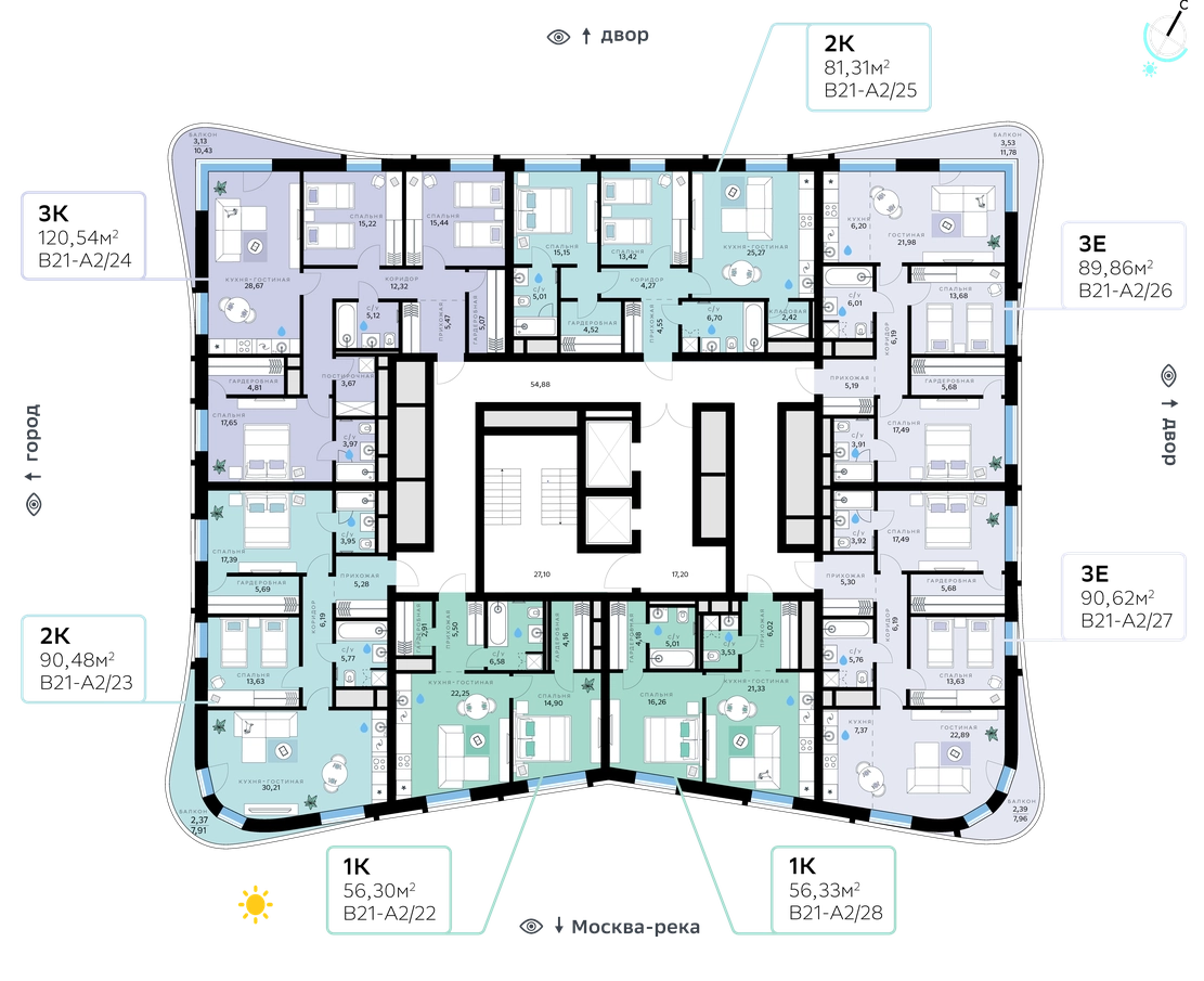 В продаже — двухкомнатная квартира, общей площадью 89,86 кв. м. Квартира расположена на пятом этаже тринадцатиэтажной секции корпуса класса Адвансд в новом районе СберСити, который строит Сбер. Дом находится на второй береговой линии Москвы-реки.<br><br>Сочетание элегантной архитектуры от ведущего итальянского бюро и передовых технологий на всех уровнях — от квартиры до инфраструктуры района. Отделка фасадов корпуса класса Адвансд выполнена из природного камня, глазурованной плитки и алюминия.<br><br>Дом возводится по технологии монолитного строительства. Проведены работы по улучшению шумоизоляции, установлены двухкамерные стеклопакеты с низкоэмиссионными стёклами, минимизирующими теплопотери. Высота окон — от 3 до 3,25 м.<br><br>В квартирах предустановлена система «умный дом» — комплекс решений, объединяющий квартиру, дом и прилегающую территорию. Жильцы смогут регулировать климат и освещение голосом или со смартфона, а также управлять сценариями освещения по заданным параметрам.<br><br>В доме расположены:<br>• уютное лобби,<br>• лапомойка,<br>• общественная терраса,<br>• коворкинг для жителей,<br>• собственная спортивная студия,<br>• колясочная и велосипедная комната на первом этаже,<br>• детская игровая комната,<br>• подземный паркинг.<br><br>СберСити — это новый жилой и деловой район на западе Москвы, в одном из самых экологически чистых и престижных мест столицы. Это первая в России и крупнейшая в мире инновационная городская среда, созданная по международным стандартам зелёного проектирования. Здесь внедряются решения в области энергоснабжения, вакуумного мусороудаления, тестирования зелёных технологий, а в дальнейшем — системы искусственного интеллекта для управления домами и городской инфраструктурой.<br>Строительство проекта началось в 2021 году, заселение первых корпусов — с лета 2024-го. Общая площадь территории — 461 га, из них более 2,5 млн кв. м жилья и около 833 тыс. кв. м офисных пространств. Будет построено 7 школ, 13 детских садов и 2 поликлиники. В СберСити будут жить 65 тыс. человек и работать 70 тыс. Развитием территории занимается АО «Рублёво-Архангельское», входящее в группу Сбер.<br>СберСити — место, где хочется жить, работать и растить детей.<br><br>Переезжайте в СберСити!О застройщике