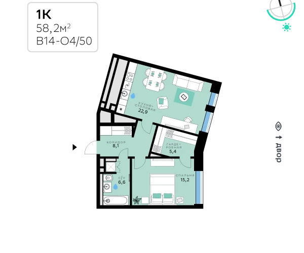 В продаже — однокомнатная квартира, общей площадью 58,2 кв. м. Квартира расположена на седьмом этаже девятиэтажного корпуса Оптимум в квартале В14 нового района СберСити, который строит Сбер.Архитектуру корпусов квартала разработало итальянское бюро. В облике отражена природная палитра: фасады выполнены в тёплой гамме и отличаются геометричной сеткой объёмных элементов светло-бежевого оттенка. За ними скрываются вставки с текстурой под дерево, создающие игру света и тени. Из окон открываются виды на парк и реку, а всего в трёх минутах пешком — набережная. В14 примыкает к главному парку СберСити. В квартале — уютные дворы без машин с крупномерными растениями, кустарниками, многолетними цветами, детскими площадками и зонами отдыха.