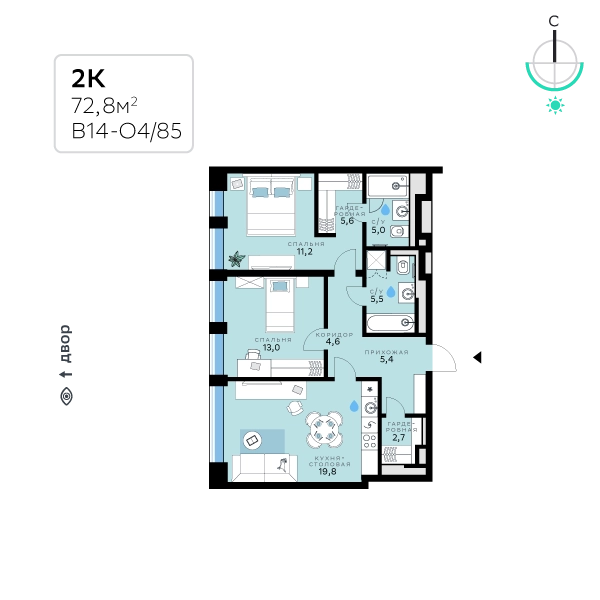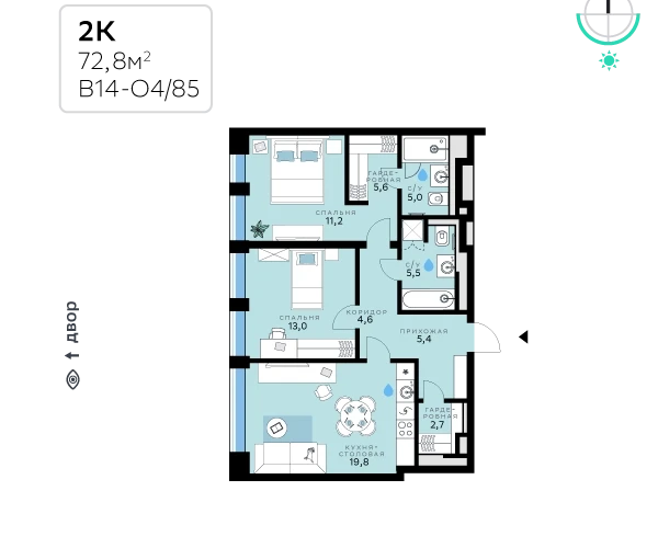 В продаже — двухкомнатная квартира, общей площадью 72,8 кв. м. Квартира расположена на шестом этаже десятиэтажного корпуса Оптимум в квартале В14 нового района СберСити, который строит Сбер.Архитектуру корпусов квартала разработало итальянское бюро. В облике отражена природная палитра: фасады выполнены в тёплой гамме и отличаются геометричной сеткой объёмных элементов светло-бежевого оттенка. За ними скрываются вставки с текстурой под дерево, создающие игру света и тени. Из окон открываются виды на парк и реку, а всего в трёх минутах пешком — набережная. В14 примыкает к главному парку СберСити. В квартале — уютные дворы без машин с крупномерными растениями, кустарниками, многолетними цветами, детскими площадками и зонами отдыха.