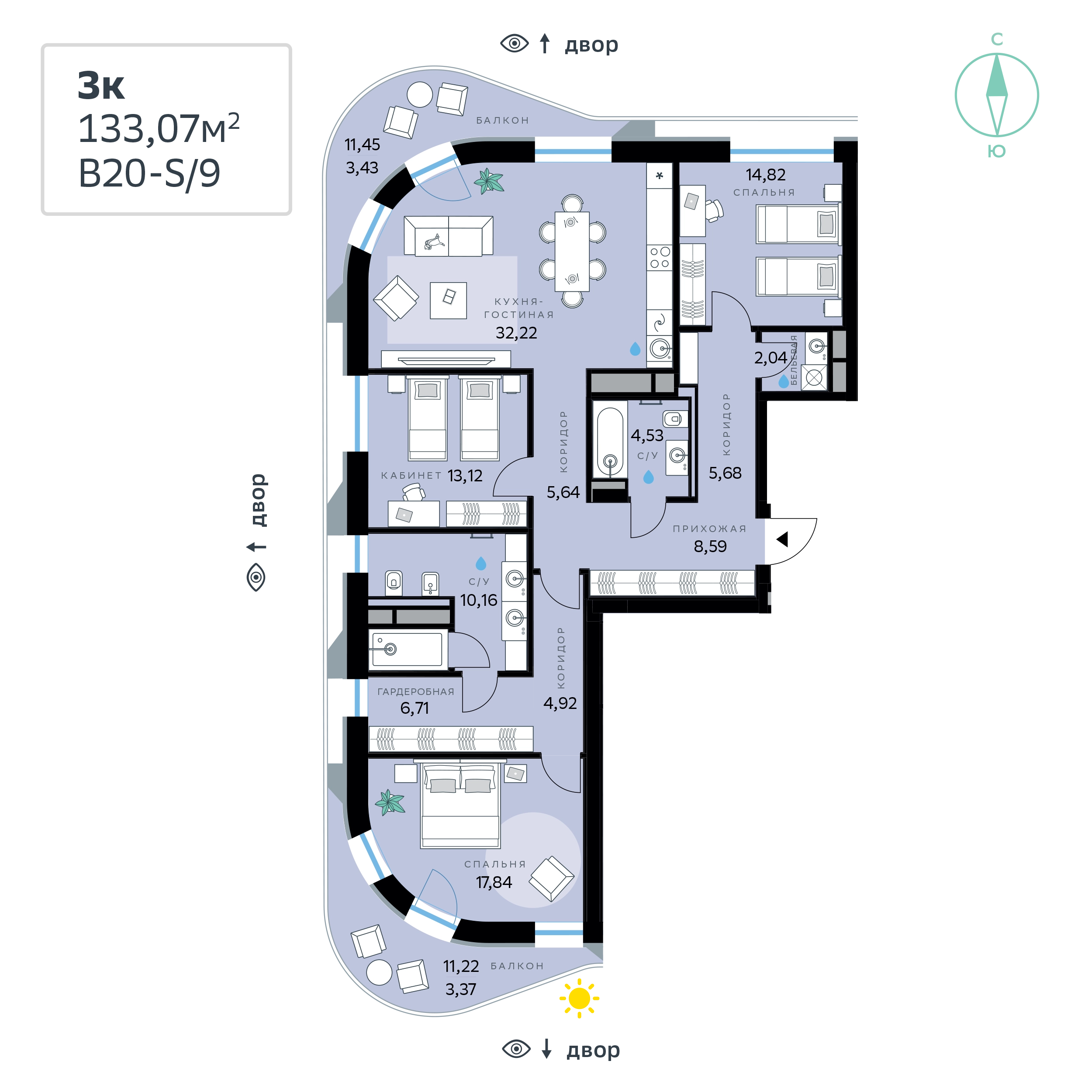 В продаже — трехкомнатная квартира с чистовой отделкой, общей площадью 133,07 кв. м. Квартира расположена на втором этаже семиэтажной секции клубного дома класса Суперб в новом районе СберСити, который строит Сбер. Дом находится на первой береговой линии Москвы-реки.Отделка фасадов корпуса класса Суперб выполнена из природного камня. Дом возводится по технологии монолитного строительства. В квартире проведены работы по улучшению шумоизоляции, установлены двухкамерные стеклопакеты с низкоэмиссионными стёклами, минимизирующими теплопотери. Высота окон — от 3,1 до 3,25 м.