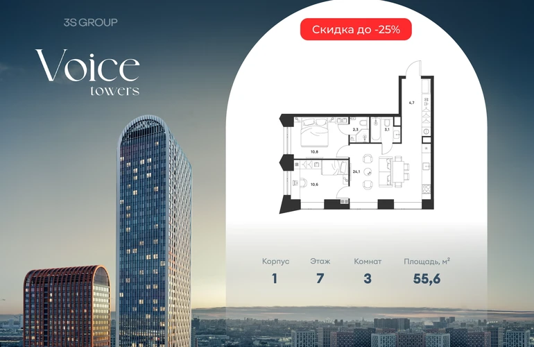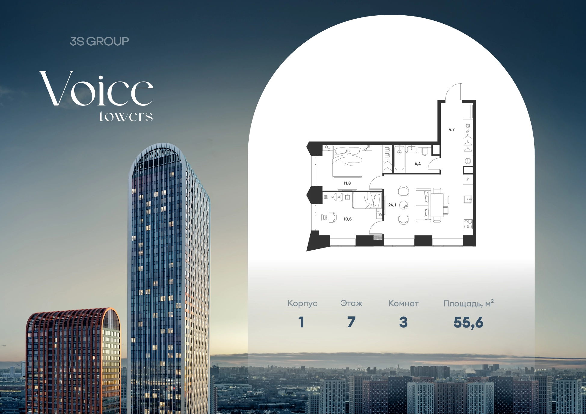 Ипотека от 3,5% на весь срок. Дополнительная скидка в офисе продаж! Продается уютная 2-комн. квартира площадью 55,6 кв.м на 7 этаже жилого комплекса бизнес-класса Voice Towers от 3S Group. Общая площадь: 55,6 кв.м., жилая: 33,7 кв.м., площадь кухни-гостиной: 20,8 кв.м., высокие потолки: 3,12 м., санузел совмещенный. О проекте: Voice. Высокие стандарты жизни Мы уверены, что высокие идеалы неизменно помогают достигать высот. Создавая Voice, мы ориентировались на людей с высокими требованиями к качеству и безупречным вкусом. Башни жилого комплекса, сочетают элегантную форму с динамичной геометрией фасадов, устремляются ввысь и отвечают самым высоким стандартам строительства. Технологичность, воплощенная в архитектуре - это ваш, собственный Voice. Преимущества локации Близость к метро Текстильщики, БКЛ и МЦК Новохохловская (10 мин) Рядом природный заповедник и конно-спортивная база Кузьминки-Люблино Будущее окружение Проект Южный порт - Текстильщики с деловым центром Сити-2 Небоскребы высотой до 300м Культурный центр с амфитеатром Променад вдоль Москвы-реки и яхт-клуб Архитектура Проект от Архитектурной мастерской Алексея Ильина Две перпендикулярные башни с арочными вершинами Высокая башня: светло-серый металл Низкая башня: терракотовая керамика Благоустройство Внешняя зона: парковки, магазины, кафе Внутренний двор: закрытая территория с озеленением Шумозащитный экран Сезонное озеленение Встречи на высоте Гранд-лобби высотой 8м Дизайнерская мебель Умные скоростные лифты Услуги Детский центр с игровой зоной Фитнес-студия для жителейО застройщике