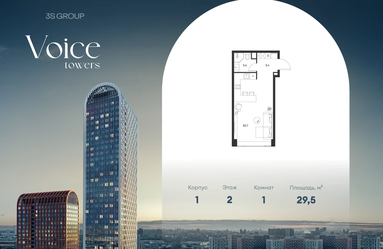 Ипотека от 3,5% на весь срок. Дополнительная скидка в офисе продаж! Продается уютная студия площадью 29,5 кв.м на 2 этаже жилого комплекса бизнес-класса Voice Towers от 3S Group. Общая площадь: 29,5 кв.м., жилая: 17,2 кв.м., площадь кухни-гостиной: 22,7 кв.м., высокие потолки: 3,12 м., санузел совмещенный. О проекте: Voice. Высокие стандарты жизни Мы уверены, что высокие идеалы неизменно помогают достигать высот. Создавая Voice, мы ориентировались на людей с высокими требованиями к качеству и безупречным вкусом. Башни жилого комплекса, сочетают элегантную форму с динамичной геометрией фасадов, устремляются ввысь и отвечают самым высоким стандартам строительства. Технологичность, воплощенная в архитектуре - это ваш, собственный Voice. Преимущества локации Близость к метро Текстильщики, БКЛ и МЦК Новохохловская (10 мин) Рядом природный заповедник и конно-спортивная база Кузьминки-Люблино Будущее окружение Проект Южный порт - Текстильщики с деловым центром Сити-2 Небоскребы высотой до 300м Культурный центр с амфитеатром Променад вдоль Москвы-реки и яхт-клуб Архитектура Проект от Архитектурной мастерской Алексея Ильина Две перпендикулярные башни с арочными вершинами Высокая башня: светло-серый металл Низкая башня: терракотовая керамика Благоустройство Внешняя зона: парковки, магазины, кафе Внутренний двор: закрытая территория с озеленением Шумозащитный экран Сезонное озеленение Встречи на высоте Гранд-лобби высотой 8м Дизайнерская мебель Умные скоростные лифты Услуги Детский центр с игровой зоной Фитнес-студия для жителейО застройщике