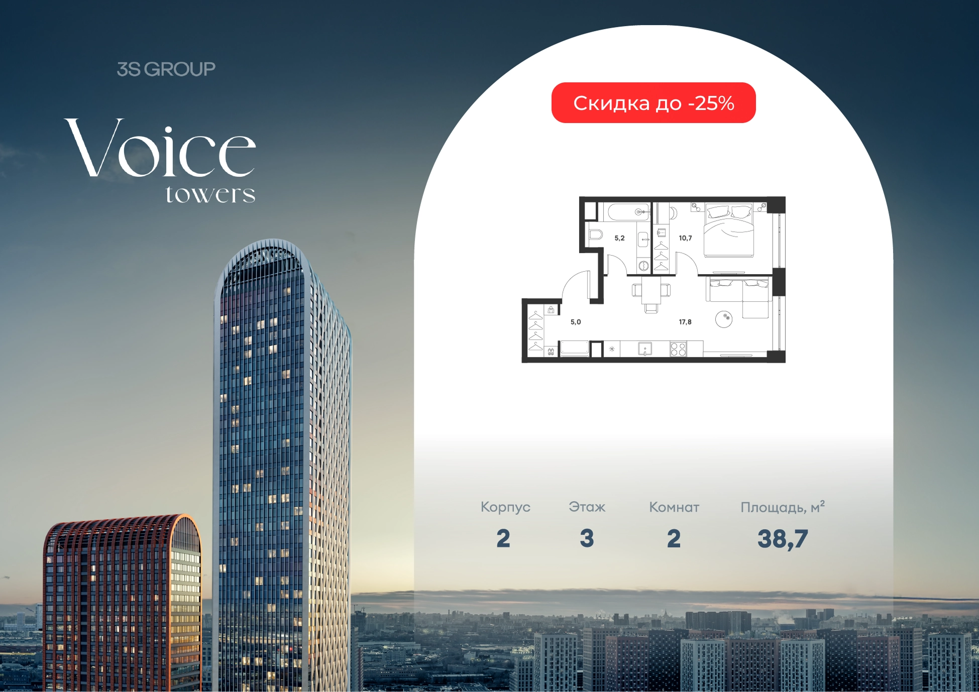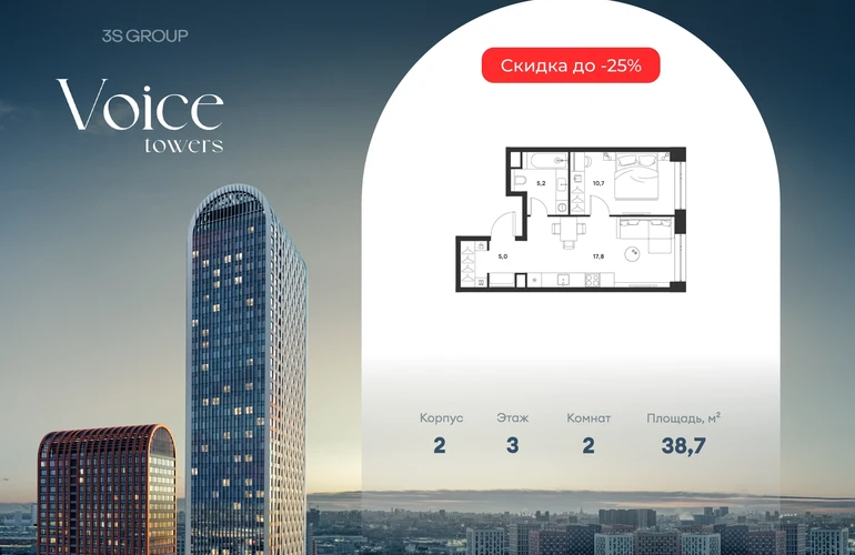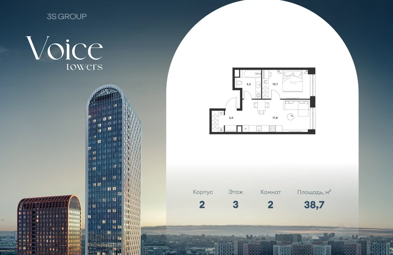 Ипотека от 3,5% на весь срок. Дополнительная скидка в офисе продаж! Продается уютная 1-комн. квартира площадью 38,7 кв.м на 3 этаже жилого комплекса бизнес-класса Voice Towers от 3S Group. Общая площадь: 38,7 кв.м., жилая: 18,1 кв.м., площадь кухни-гостиной: 17,8 кв.м., высокие потолки: 3,12 м., санузел совмещенный. О проекте: Voice. Высокие стандарты жизни Мы уверены, что высокие идеалы неизменно помогают достигать высот. Создавая Voice, мы ориентировались на людей с высокими требованиями к качеству и безупречным вкусом. Башни жилого комплекса, сочетают элегантную форму с динамичной геометрией фасадов, устремляются ввысь и отвечают самым высоким стандартам строительства. Технологичность, воплощенная в архитектуре - это ваш, собственный Voice. Преимущества локации Близость к метро Текстильщики, БКЛ и МЦК Новохохловская (10 мин) Рядом природный заповедник и конно-спортивная база Кузьминки-Люблино Будущее окружение Проект Южный порт - Текстильщики с деловым центром Сити-2 Небоскребы высотой до 300м Культурный центр с амфитеатром Променад вдоль Москвы-реки и яхт-клуб Архитектура Проект от Архитектурной мастерской Алексея Ильина Две перпендикулярные башни с арочными вершинами Высокая башня: светло-серый металл Низкая башня: терракотовая керамика Благоустройство Внешняя зона: парковки, магазины, кафе Внутренний двор: закрытая территория с озеленением Шумозащитный экран Сезонное озеленение Встречи на высоте Гранд-лобби высотой 8м Дизайнерская мебель Умные скоростные лифты Услуги Детский центр с игровой зоной Фитнес-студия для жителейО застройщике