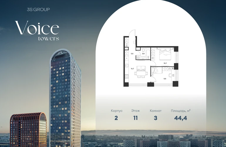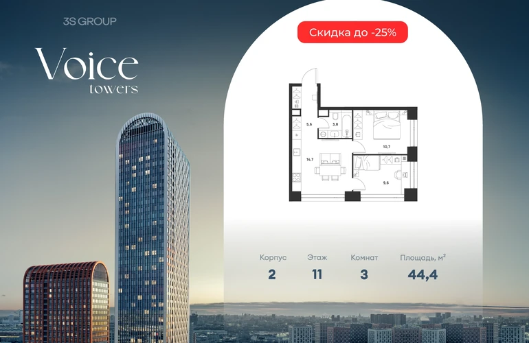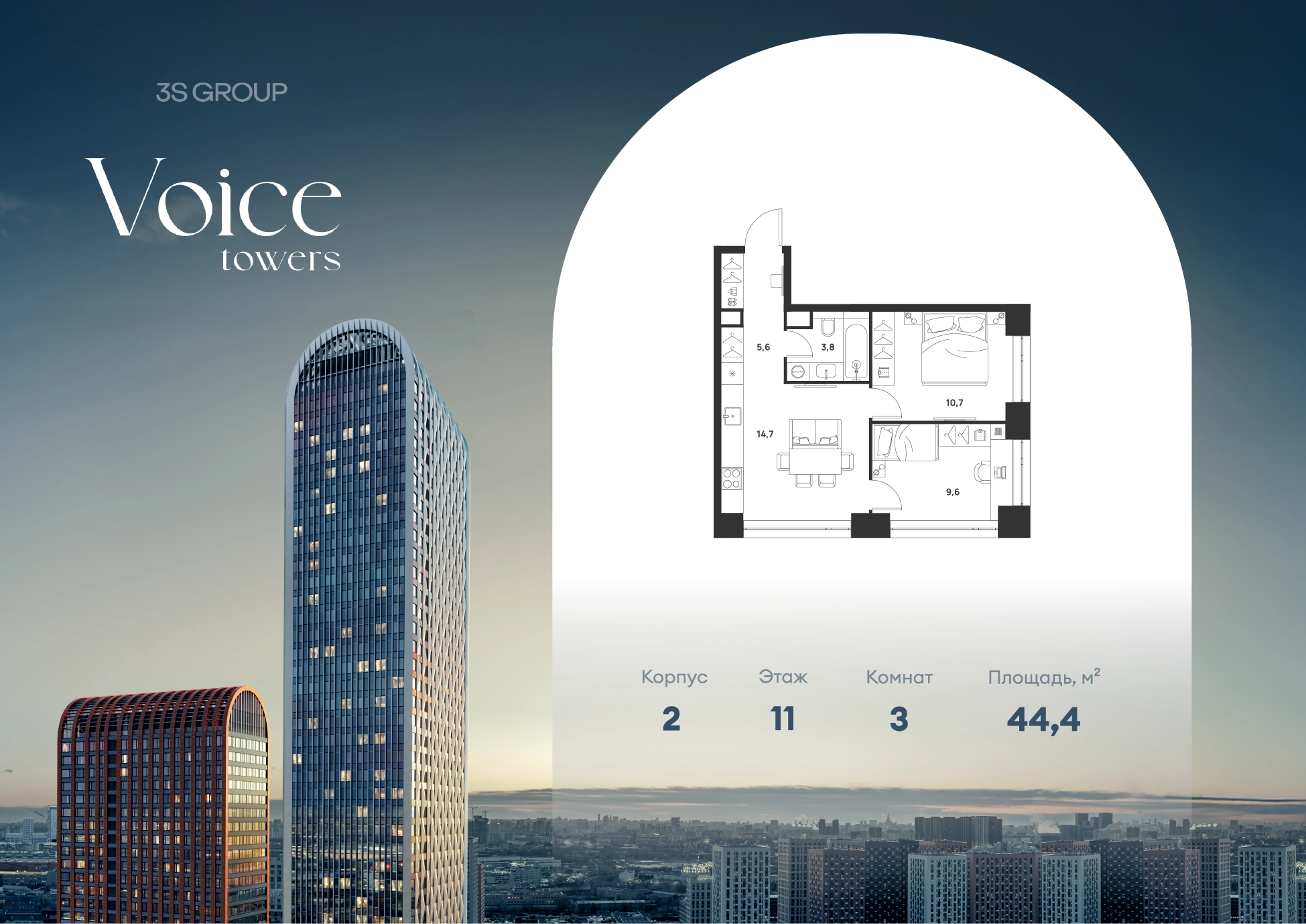 Ипотека от 3,5% на весь срок. Дополнительная скидка в офисе продаж! Продается уютная 2-комн. квартира площадью 44,4 кв.м на 11 этаже жилого комплекса бизнес-класса Voice Towers от 3S Group. Общая площадь: 44,4 кв.м., жилая: 28,7 кв.м., площадь кухни-гостиной: 14,7 кв.м., высокие потолки: 3,12 м., санузел совмещенный. О проекте: Voice. Высокие стандарты жизни Мы уверены, что высокие идеалы неизменно помогают достигать высот. Создавая Voice, мы ориентировались на людей с высокими требованиями к качеству и безупречным вкусом. Башни жилого комплекса, сочетают элегантную форму с динамичной геометрией фасадов, устремляются ввысь и отвечают самым высоким стандартам строительства. Технологичность, воплощенная в архитектуре - это ваш, собственный Voice. Преимущества локации Близость к метро Текстильщики, БКЛ и МЦК Новохохловская (10 мин) Рядом природный заповедник и конно-спортивная база Кузьминки-Люблино Будущее окружение Проект Южный порт - Текстильщики с деловым центром Сити-2 Небоскребы высотой до 300м Культурный центр с амфитеатром Променад вдоль Москвы-реки и яхт-клуб Архитектура Проект от Архитектурной мастерской Алексея Ильина Две перпендикулярные башни с арочными вершинами Высокая башня: светло-серый металл Низкая башня: терракотовая керамика Благоустройство Внешняя зона: парковки, магазины, кафе Внутренний двор: закрытая территория с озеленением Шумозащитный экран Сезонное озеленение Встречи на высоте Гранд-лобби высотой 8м Дизайнерская мебель Умные скоростные лифты Услуги Детский центр с игровой зоной Фитнес-студия для жителейО застройщике