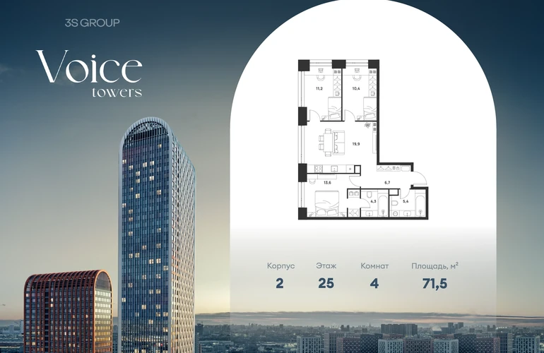 Ипотека от 3,5% на весь срок. Дополнительная скидка в офисе продаж! Продается уютная 3-комн. квартира площадью 71,5 кв.м на 25 этаже жилого комплекса бизнес-класса Voice Towers от 3S Group. Общая площадь: 71,5 кв.м., жилая: 49,8 кв.м., площадь кухни-гостиной: 19,9 кв.м., высокие потолки: 3,12 м., санузел совмещенный. О проекте: Voice. Высокие стандарты жизни Мы уверены, что высокие идеалы неизменно помогают достигать высот. Создавая Voice, мы ориентировались на людей с высокими требованиями к качеству и безупречным вкусом. Башни жилого комплекса, сочетают элегантную форму с динамичной геометрией фасадов, устремляются ввысь и отвечают самым высоким стандартам строительства. Технологичность, воплощенная в архитектуре - это ваш, собственный Voice. Преимущества локации Близость к метро Текстильщики, БКЛ и МЦК Новохохловская (10 мин) Рядом природный заповедник и конно-спортивная база Кузьминки-Люблино Будущее окружение Проект Южный порт - Текстильщики с деловым центром Сити-2 Небоскребы высотой до 300м Культурный центр с амфитеатром Променад вдоль Москвы-реки и яхт-клуб Архитектура Проект от Архитектурной мастерской Алексея Ильина Две перпендикулярные башни с арочными вершинами Высокая башня: светло-серый металл Низкая башня: терракотовая керамика Благоустройство Внешняя зона: парковки, магазины, кафе Внутренний двор: закрытая территория с озеленением Шумозащитный экран Сезонное озеленение Встречи на высоте Гранд-лобби высотой 8м Дизайнерская мебель Умные скоростные лифты Услуги Детский центр с игровой зоной Фитнес-студия для жителейО застройщике