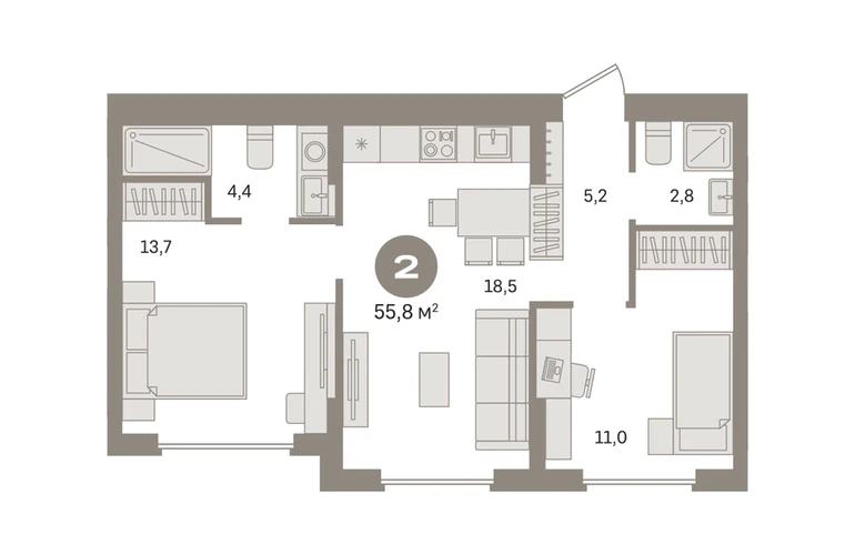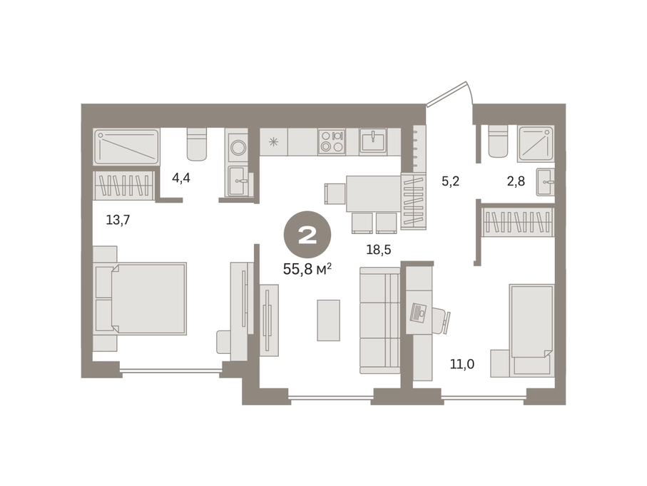 Продаётся с кладовой. Квартира с кухней-гостиной и двумя спальнями в «Первом квартале». Особенности планировки: мастер-спальня, предчистовая отделка, разнесённые спальни. № квартиры в нашей базе: МТК06-Ж3.9.3.О застройщике