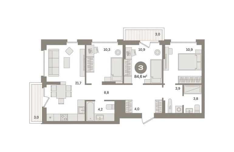 Квартира с кухней-гостиной и тремя спальнями в «Первом квартале». Особенности планировки: балкон, второй санузел, постирочная, предчистовая отделка, рабочий кабинет, разнесённые спальни. № квартиры в нашей базе: МТК02-Ж2.4.7.О застройщике
