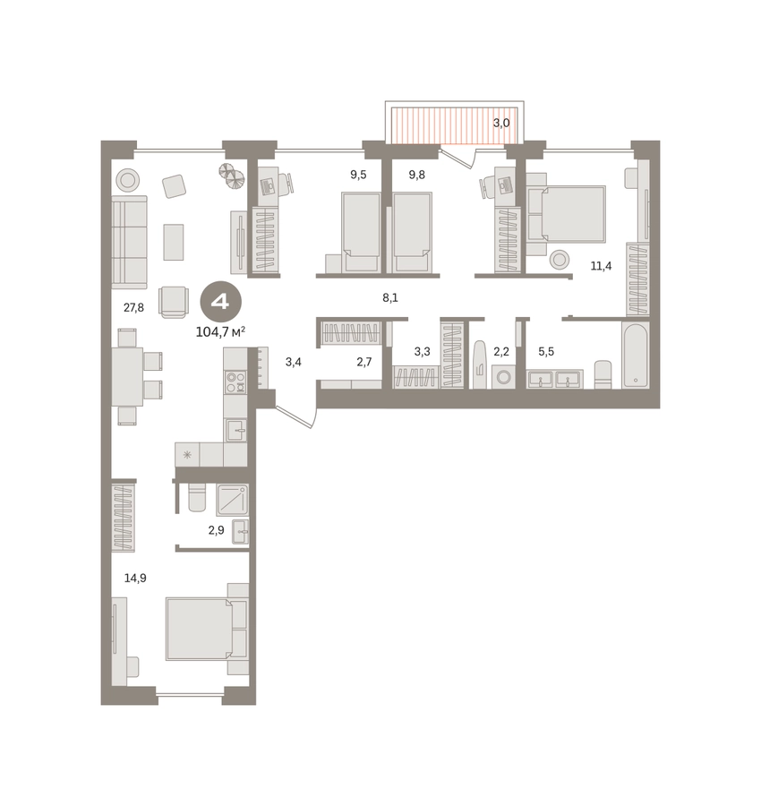 Квартира с кухней-гостиной и четырьмя спальнями в «Первом квартале». Особенности планировки: балкон, вид во двор, гардеробная, мастер-спальня, окна на две стороны, постирочная, предчистовая отделка, рабочий кабинет, разнесённые спальни. № квартиры в нашей базе: МТК03-Ж3.5.1.О застройщике