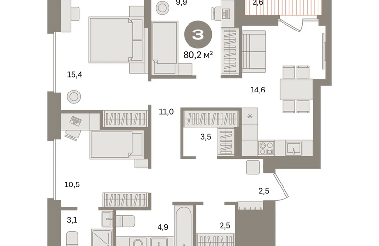 Квартира с кухней-гостиной и тремя спальнями в «Первом квартале». Особенности планировки: второй санузел, гардеробная, лоджия, мастер-спальня, постирочная, предчистовая отделка. № квартиры в нашей базе: МТК02-Ж4.14.1.О застройщике