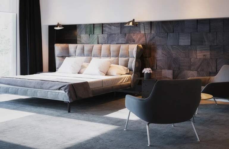 Элитная отделка лобби (натуральные материалы, мягкое освещение)