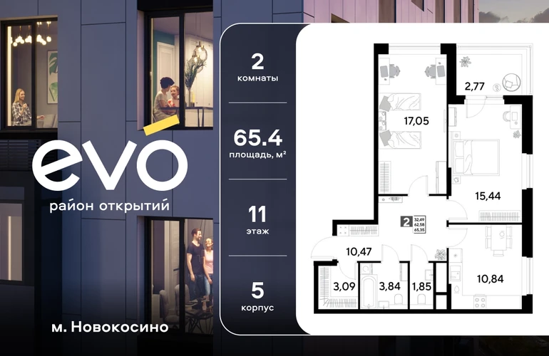 Продается двухкомнатная квартира 65.35 кв.м. в жилом комплексе ЭВО на 11 этаже по адресу: Московская область, г. Реутов, ул. Комсомольская. Скидка 15% на выделенный пул двухкомнатных и трёхкомнатных квартир с готовностью в 2026 году!* ЭВО - проект комфорт-класса от девелопера Dogma. Каждый житель сможет открыть для себя максимум возможностей. Совершенствоваться во всех направлениях: физическом, эмоциональном и материальном. В ЭВО можно открыть для себя новые виды спорта, найти единомышленников по хобби, партнеров по бизнесу, развивать в детях новые грани, наслаждаться природой и лаконичной архитектурой. Более 6 га благоустройства в первой очереди! - Зеленый двор без машин, кленовая аллея для прогулок. - Нейродинамические площадки для детей разных возрастов. - Workout зона, столы для пинг-понга, места для занятия йогой. велодорожки и дорожки для скандинавской ходьбы. - Детский сад на 180 мест и школа на 750 мест. - Кроссбукинг. - Лобби с зоной ожидания, колясочной и лапомойкой. - Магазины и кафе на первых этажах. БЕЗОПАСНОСТЬ - Закрытая территория. - Круглосуточное видеонаблюдение. - Контроль доступа. РАСПОЛОЖЕНИЕ Пешком - 7 минут до станции Реутов. - 20 минут до метро Новокосино. На машине - 4 минуты до МКАД. - 6 минут до шоссе Энтузиастов. - 9 минут до Носовихинское шоссе. - 13 минут до МСД (Московский скоростной диаметр). СОЦИАЛЬНАЯ ИНФРАСТРУКТУРА В первой очереди предусмотрено строительство детского сада на 180 мест и школы на 750 учащихся. В 10 минутах ходьбы от ЭВО находится детский технопарк "Изобретариум", в котором более 60 научных секции: от IT до промышленного дизайна. Для творческих ребят рядом есть художественная и музыкальные школы, хоровая студия. ОКРУЖЕНИЕ - Реутовский центральный парк, Александровский сквер, Фабричный пруд. - ТЦ "Экватор", ТК "Шоколад". - Спортивный комплекс "Старт", Ледовый комплекс "Реутов Арена". - Музей-усадьба "Кусково". *Акция действует до 15.02.2026. Подробности уточняйте по телефону.О застройщике