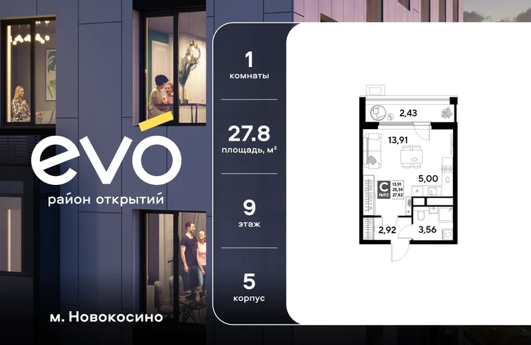 Продается студия 27.82 кв.м. в жилом комплексе ЭВО на 9 этаже по адресу: Московская область, г. Реутов, ул. Комсомольская. Скидка 15% на выделенный пул двухкомнатных и трёхкомнатных квартир с готовностью в 2026 году!* ЭВО - проект комфорт-класса от девелопера Dogma. Каждый житель сможет открыть для себя максимум возможностей. Совершенствоваться во всех направлениях: физическом, эмоциональном и материальном. В ЭВО можно открыть для себя новые виды спорта, найти единомышленников по хобби, партнеров по бизнесу, развивать в детях новые грани, наслаждаться природой и лаконичной архитектурой. Более 6 га благоустройства в первой очереди! - Зеленый двор без машин, кленовая аллея для прогулок. - Нейродинамические площадки для детей разных возрастов. - Workout зона, столы для пинг-понга, места для занятия йогой. велодорожки и дорожки для скандинавской ходьбы. - Детский сад на 180 мест и школа на 750 мест. - Кроссбукинг. - Лобби с зоной ожидания, колясочной и лапомойкой. - Магазины и кафе на первых этажах. БЕЗОПАСНОСТЬ - Закрытая территория. - Круглосуточное видеонаблюдение. - Контроль доступа. РАСПОЛОЖЕНИЕ Пешком - 7 минут до станции Реутов. - 20 минут до метро Новокосино. На машине - 4 минуты до МКАД. - 6 минут до шоссе Энтузиастов. - 9 минут до Носовихинское шоссе. - 13 минут до МСД (Московский скоростной диаметр). СОЦИАЛЬНАЯ ИНФРАСТРУКТУРА В первой очереди предусмотрено строительство детского сада на 180 мест и школы на 750 учащихся. В 10 минутах ходьбы от ЭВО находится детский технопарк "Изобретариум", в котором более 60 научных секции: от IT до промышленного дизайна. Для творческих ребят рядом есть художественная и музыкальные школы, хоровая студия. ОКРУЖЕНИЕ - Реутовский центральный парк, Александровский сквер, Фабричный пруд. - ТЦ "Экватор", ТК "Шоколад". - Спортивный комплекс "Старт", Ледовый комплекс "Реутов Арена". - Музей-усадьба "Кусково". *Акция действует до 15.02.2026. Подробности уточняйте по телефону.О застройщике
