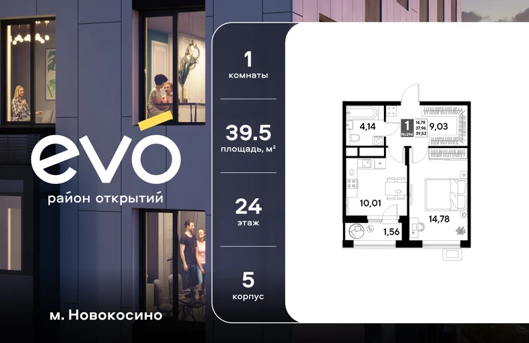 Продается однокомнатная квартира 39.52 кв.м. в жилом комплексе ЭВО на 24 этаже по адресу: Московская область, г. Реутов, ул. Комсомольская. Скидка 15% на выделенный пул двухкомнатных и трёхкомнатных квартир с готовностью в 2026 году!* ЭВО - проект комфорт-класса от девелопера Dogma. Каждый житель сможет открыть для себя максимум возможностей. Совершенствоваться во всех направлениях: физическом, эмоциональном и материальном. В ЭВО можно открыть для себя новые виды спорта, найти единомышленников по хобби, партнеров по бизнесу, развивать в детях новые грани, наслаждаться природой и лаконичной архитектурой. Более 6 га благоустройства в первой очереди! - Зеленый двор без машин, кленовая аллея для прогулок. - Нейродинамические площадки для детей разных возрастов. - Workout зона, столы для пинг-понга, места для занятия йогой. велодорожки и дорожки для скандинавской ходьбы. - Детский сад на 180 мест и школа на 750 мест. - Кроссбукинг. - Лобби с зоной ожидания, колясочной и лапомойкой. - Магазины и кафе на первых этажах. БЕЗОПАСНОСТЬ - Закрытая территория. - Круглосуточное видеонаблюдение. - Контроль доступа. РАСПОЛОЖЕНИЕ Пешком - 7 минут до станции Реутов. - 20 минут до метро Новокосино. На машине - 4 минуты до МКАД. - 6 минут до шоссе Энтузиастов. - 9 минут до Носовихинское шоссе. - 13 минут до МСД (Московский скоростной диаметр). СОЦИАЛЬНАЯ ИНФРАСТРУКТУРА В первой очереди предусмотрено строительство детского сада на 180 мест и школы на 750 учащихся. В 10 минутах ходьбы от ЭВО находится детский технопарк "Изобретариум", в котором более 60 научных секции: от IT до промышленного дизайна. Для творческих ребят рядом есть художественная и музыкальные школы, хоровая студия. ОКРУЖЕНИЕ - Реутовский центральный парк, Александровский сквер, Фабричный пруд. - ТЦ "Экватор", ТК "Шоколад". - Спортивный комплекс "Старт", Ледовый комплекс "Реутов Арена". - Музей-усадьба "Кусково". *Акция действует до 15.02.2026. Подробности уточняйте по телефону.О застройщике