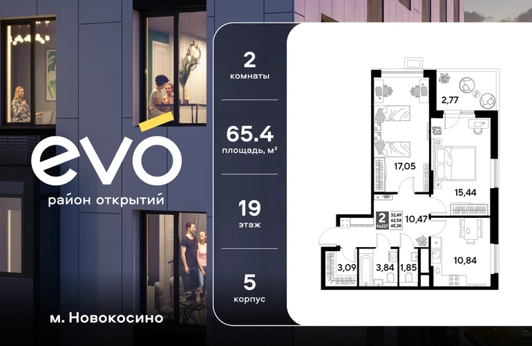 Продается двухкомнатная квартира 65.35 кв.м. в жилом комплексе ЭВО на 19 этаже по адресу: Московская область, г. Реутов, ул. Комсомольская. Скидка 15% на выделенный пул двухкомнатных и трёхкомнатных квартир с готовностью в 2026 году!* ЭВО - проект комфорт-класса от девелопера Dogma. Каждый житель сможет открыть для себя максимум возможностей. Совершенствоваться во всех направлениях: физическом, эмоциональном и материальном. В ЭВО можно открыть для себя новые виды спорта, найти единомышленников по хобби, партнеров по бизнесу, развивать в детях новые грани, наслаждаться природой и лаконичной архитектурой. Более 6 га благоустройства в первой очереди! - Зеленый двор без машин, кленовая аллея для прогулок. - Нейродинамические площадки для детей разных возрастов. - Workout зона, столы для пинг-понга, места для занятия йогой. велодорожки и дорожки для скандинавской ходьбы. - Детский сад на 180 мест и школа на 750 мест. - Кроссбукинг. - Лобби с зоной ожидания, колясочной и лапомойкой. - Магазины и кафе на первых этажах. БЕЗОПАСНОСТЬ - Закрытая территория. - Круглосуточное видеонаблюдение. - Контроль доступа. РАСПОЛОЖЕНИЕ Пешком - 7 минут до станции Реутов. - 20 минут до метро Новокосино. На машине - 4 минуты до МКАД. - 6 минут до шоссе Энтузиастов. - 9 минут до Носовихинское шоссе. - 13 минут до МСД (Московский скоростной диаметр). СОЦИАЛЬНАЯ ИНФРАСТРУКТУРА В первой очереди предусмотрено строительство детского сада на 180 мест и школы на 750 учащихся. В 10 минутах ходьбы от ЭВО находится детский технопарк "Изобретариум", в котором более 60 научных секции: от IT до промышленного дизайна. Для творческих ребят рядом есть художественная и музыкальные школы, хоровая студия. ОКРУЖЕНИЕ - Реутовский центральный парк, Александровский сквер, Фабричный пруд. - ТЦ "Экватор", ТК "Шоколад". - Спортивный комплекс "Старт", Ледовый комплекс "Реутов Арена". - Музей-усадьба "Кусково". *Акция действует до 15.02.2026. Подробности уточняйте по телефону.О застройщике