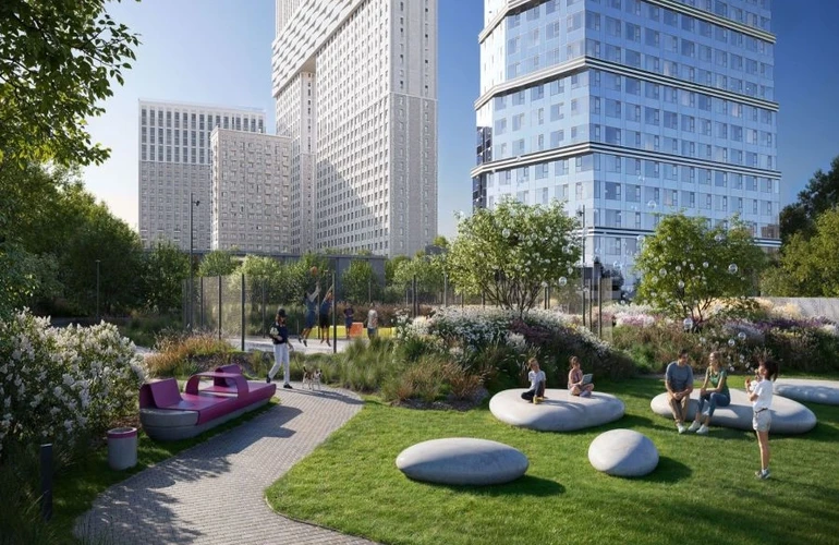 Территорию комплекса украшает ландшафтный двор с зонированием на 6 тематических пространств: от тихого парка с беседками до спортивных площадок и детских игровых зон. Инфраструктура включает социальный хаб, кинозал, коворкинг и киберспортивную комнату. Район обеспечен образовательными учреждениями и торговыми центрами. Безопасность обеспечивает система видеонаблюдения, а для автомобилей оборудован двухуровневый паркинг с зарядными станциями для электромобилей.
