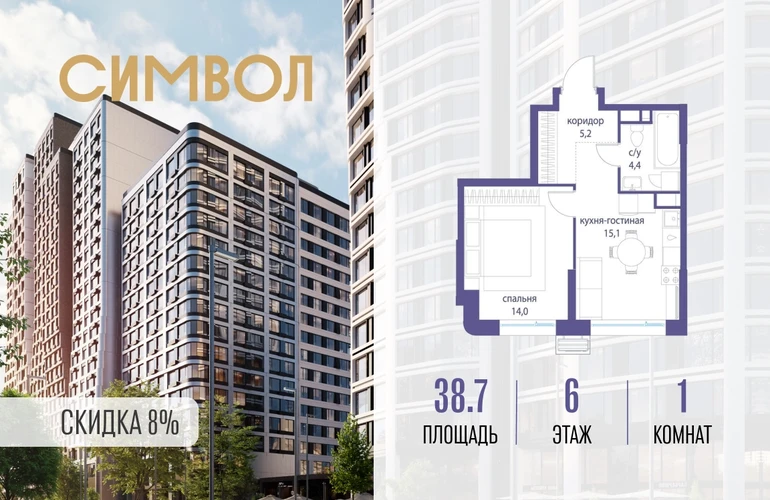 Продается 1-комнатная квартира от застройщика: общая площадь 38.70 м², жилая 14.00 м², кухня 15.10 м², 6-й этаж, жилой квартал «Гордость», корпус 36 (секция 4). Срок сдачи: 2 квартал 2029 года. Позвоните сейчас и забронируйте квартиру! Квартал бизнес-класса СИМВОЛ — это городское пространство нового поколения в историческом районе Лефортово, на границе ЦАО, в 2 км от Садового кольца. Бионическая архитектура СИМВОЛА превратила Лефортово в суперсовременное и модное пространство. Из окон, с балконов и террас просторных квартир СИМВОЛА открываются отличные виды на город и новый парк «Зеленая река», «протекающий» через все кварталы комплекса на 2 км. В квартале уже есть все, что нужно для комфортной жизни: кафе и рестораны, супермаркеты и магазины, медицинские и физкультурно-оздоровительные центры, салоны красоты и барбершопы, аптеки и оптики, химчистки, пункты доставки и другие сервисы — всего более 90 действующих объектов внутриквартальной инфраструктуры. Для юных жителей СИМВОЛА открыты детский сад и инженерный лицей при МГТУ им. Баумана. Особенности квартала: • Свой парк «Зеленая Река» - 10 га зелени и развлечений на любой вкус! • Уникальная для Москвы архитектура - Проект создан архитектурной мастерской ATRIUM по дизайн-коду британских бюро LDA Design и UHA London. • Богатая инфраструктура с детскими садами и лицеем им. Баумана, кафе и ресторанами, супермаркетами и аптеками, зоной для фитнеса, бассейном и мед. центром. • Квартиры с панорамными окнами, террасами, ванными с окнами и каминами редких форматов. • Закрытые безопасные зелёные дворы-парки без машин!О застройщике