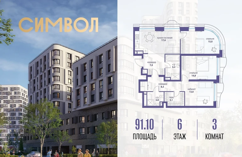 Продается 3-комнатная квартира от застройщика: общая площадь 91.10 м², жилая 42.80 м², кухня 17.60 м², 6-й этаж, жилой квартал «Вдохновение», корпус 34 (секция 1). Срок сдачи: 4 квартал 2027 года. Позвоните сейчас и забронируйте квартиру! Квартал бизнес-класса СИМВОЛ — это городское пространство нового поколения в историческом районе Лефортово, на границе ЦАО, в 2 км от Садового кольца. Бионическая архитектура СИМВОЛА превратила Лефортово в суперсовременное и модное пространство. Из окон, с балконов и террас просторных квартир СИМВОЛА открываются отличные виды на город и новый парк «Зеленая река», «протекающий» через все кварталы комплекса на 2 км. В квартале уже есть все, что нужно для комфортной жизни: кафе и рестораны, супермаркеты и магазины, медицинские и физкультурно-оздоровительные центры, салоны красоты и барбершопы, аптеки и оптики, химчистки, пункты доставки и другие сервисы — всего более 90 действующих объектов внутриквартальной инфраструктуры. Для юных жителей СИМВОЛА открыты детский сад и инженерный лицей при МГТУ им. Баумана. Особенности квартала: • Свой парк «Зеленая Река» - 10 га зелени и развлечений на любой вкус! • Уникальная для Москвы архитектура - Проект создан архитектурной мастерской ATRIUM по дизайн-коду британских бюро LDA Design и UHA London. • Богатая инфраструктура с детскими садами и лицеем им. Баумана, кафе и ресторанами, супермаркетами и аптеками, зоной для фитнеса, бассейном и мед. центром. • Квартиры с панорамными окнами, террасами, ванными с окнами и каминами редких форматов. • Закрытые безопасные зелёные дворы-парки без машин!О застройщике