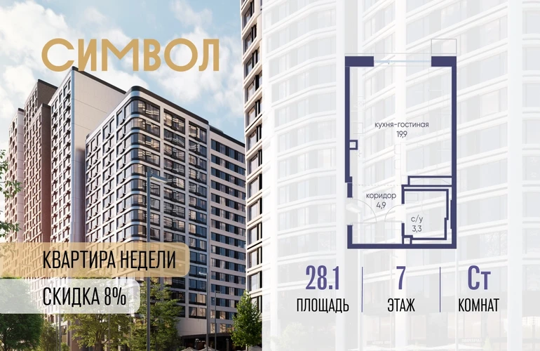 Продается квартира-студия от застройщика: общая площадь 28.10 м², жилая 15.00 м², кухня 4.90 м², 7-й этаж, жилой квартал «Гордость», корпус 40 (секция 1). Срок сдачи: 2 квартал 2029 года. Позвоните сейчас и забронируйте квартиру! Квартал бизнес-класса СИМВОЛ — это городское пространство нового поколения в историческом районе Лефортово, на границе ЦАО, в 2 км от Садового кольца. Бионическая архитектура СИМВОЛА превратила Лефортово в суперсовременное и модное пространство. Из окон, с балконов и террас просторных квартир СИМВОЛА открываются отличные виды на город и новый парк «Зеленая река», «протекающий» через все кварталы комплекса на 2 км. В квартале уже есть все, что нужно для комфортной жизни: кафе и рестораны, супермаркеты и магазины, медицинские и физкультурно-оздоровительные центры, салоны красоты и барбершопы, аптеки и оптики, химчистки, пункты доставки и другие сервисы — всего более 90 действующих объектов внутриквартальной инфраструктуры. Для юных жителей СИМВОЛА открыты детский сад и инженерный лицей при МГТУ им. Баумана. Особенности квартала: • Свой парк «Зеленая Река» - 10 га зелени и развлечений на любой вкус! • Уникальная для Москвы архитектура - Проект создан архитектурной мастерской ATRIUM по дизайн-коду британских бюро LDA Design и UHA London. • Богатая инфраструктура с детскими садами и лицеем им. Баумана, кафе и ресторанами, супермаркетами и аптеками, зоной для фитнеса, бассейном и мед. центром. • Квартиры с панорамными окнами, террасами, ванными с окнами и каминами редких форматов. • Закрытые безопасные зелёные дворы-парки без машин!О застройщике