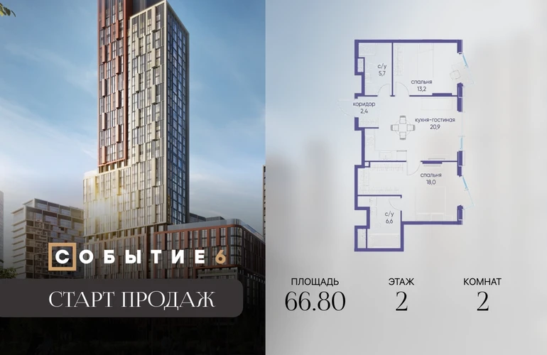 Продаётся 2-комнатная квартира от застройщика: общая площадь 66.80 м², жилая 31.20 м², кухня 20.90 м², 2-й этаж, жилой квартал «Событие-6», корпус 2 (секция 3) Срок сдачи: 1 квартал 2029 года. Позвоните сейчас и забронируйте квартиру! Продуманный до деталей. Созданный для жизни, полной счастливых событий. Парк-квартал СОБЫТИЕ — это жизнь класса премиум в престижном районе на Мосфильмовской улице. Архитектура мирового уровня. Выигрышное расположение на границе природного комплекса «Долина реки Раменки». Все для комфортной жизни и досуга: от детсадов и школ до ресторанов и медцентров. И новая точка притяжения — уже готовый парк «Событие» с пространствами активности для всех возрастов и интересов. Особенности квартала: • «Парящие» мосты и парк под облаками - уникальный дом с самыми завораживающими видами из окон «в пол» • Собственный парк — сразу за порогом! • Архитектурная концепция от известных международных бюро LDA Design и UHA London • Инфраструктура «тапочной доступности»: в кафе, школу, магазин — за пару минут! • Внутренний двор — настоящее продолжение вашего дома: закрытая охраняемая территория без машин, развивающие детские площадки, воркауты-зоны для тех, кто хочет быть в форме, площади для праздников и посиделок с соседями.О застройщике